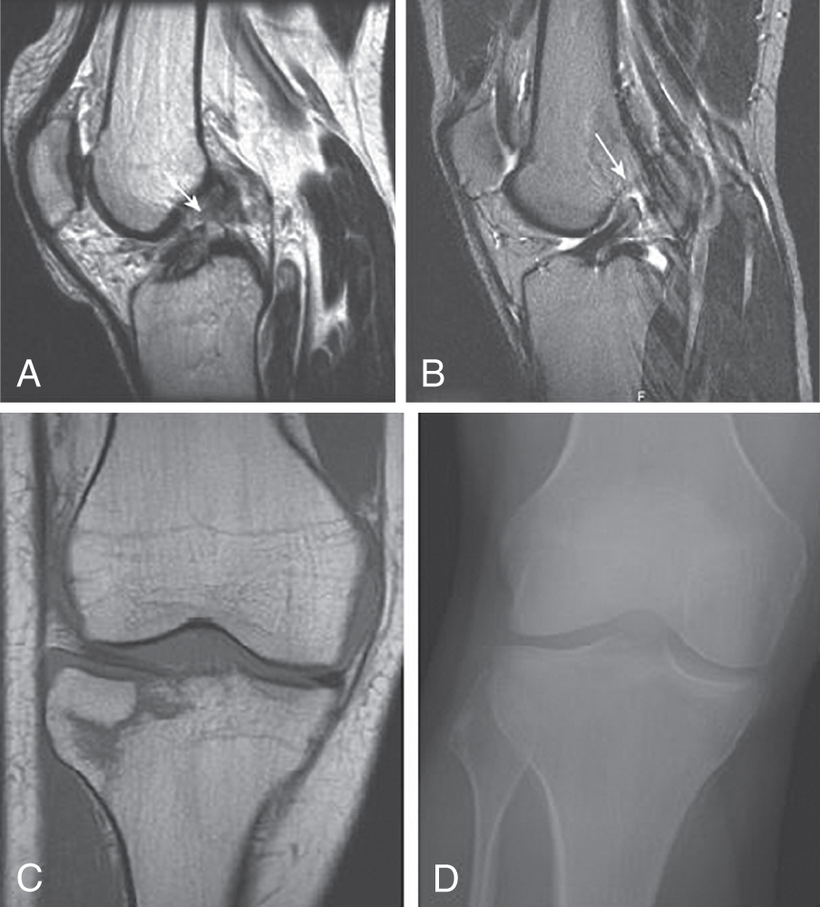 (A) Hình ảnh cộng hưởng từ (MRI) đứng dọc T1 cho thấy một vết rách giữa chất của ACL (mũi tên). (B) MRI đứng dọc T1 cho thấy một vết rách ACL từ vị trí bám gần trên xương đùi (mũi tên). (C) MRI đứng ngang T1W cho thấy một gãy mâm chày không di lệch có liên quan đến một chấn thương ACL. (D) Gãy xương không được đánh giá cao trên các phim X-quang ban đầu, vốn là bình thường.