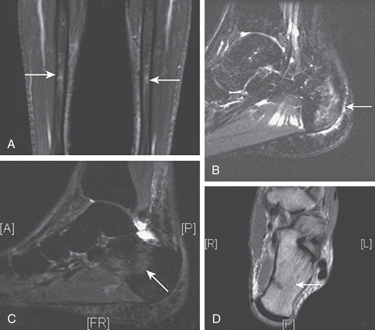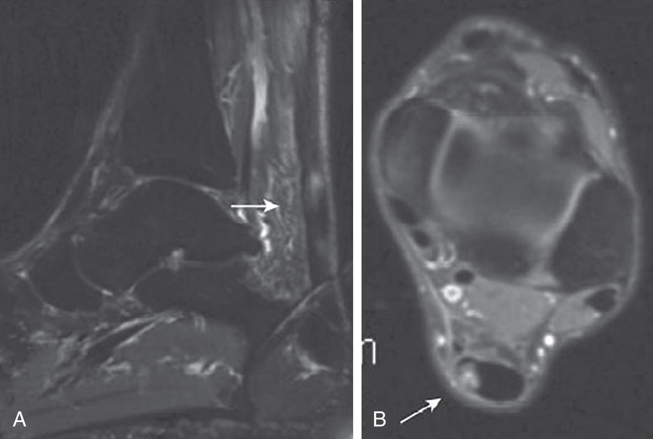 Hình ảnh cộng hưởng từ T2W, triệt tiêu mỡ, đứng dọc (A) và ngang (B) của góc, cho thấy sự dày lên lan tỏa và tín hiệu tăng trong gân Achilles phù hợp với bệnh lý gân Achilles. Bệnh nhân là một người chạy siêu marathon 42 tuổi bị đau gót chân sau cấp tính và mạn tính.