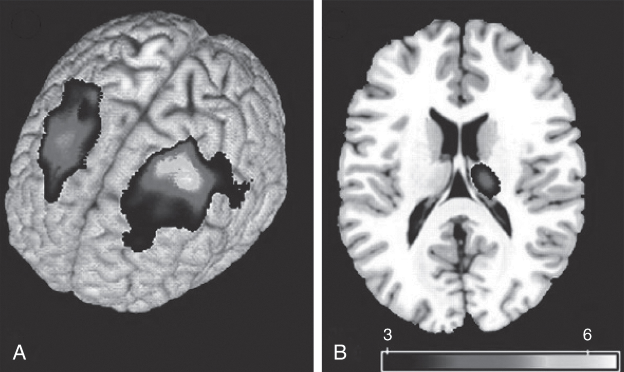 Hình 37.3 Đau lưng mạn tính có liên quan đến Giảm mật độ Chất xám Vỏ não trước trán (A) và Đồi thị (B)