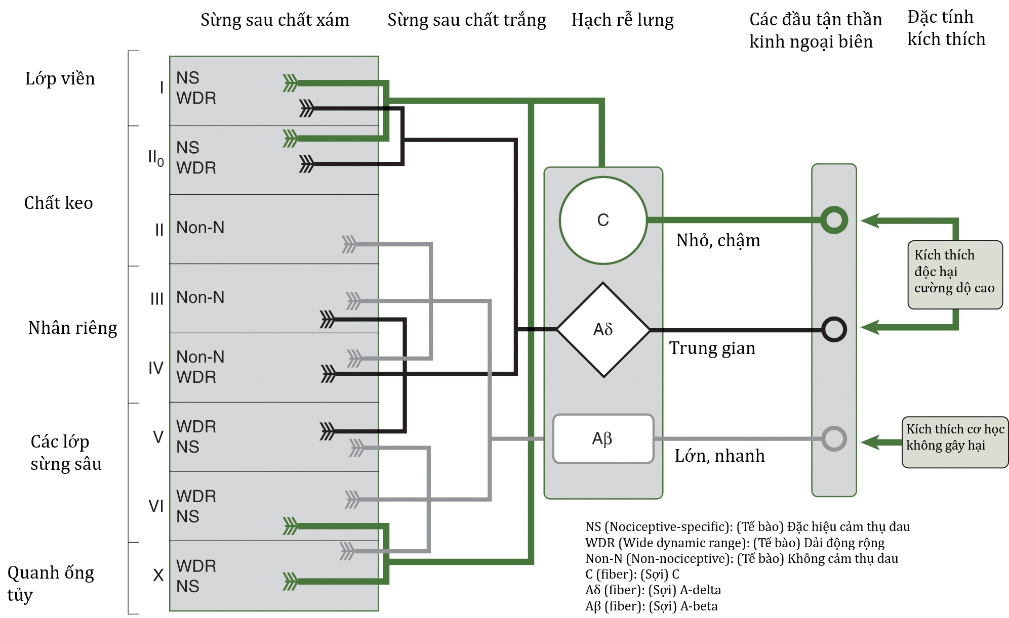 Điều biến và chuyển giao đầu vào cảm thụ đau có liên quan đến một số đường dẫn truyền lên từ sừng sau nơi các sợi hướng tâm chính hội tụ (Hình 37.5).