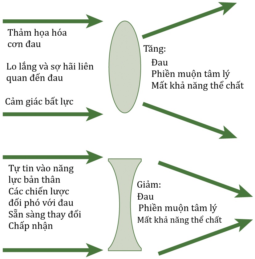 • Các yếu tố tâm lý có thể làm giảm hoặc tăng nhận thức chủ quan về cơn đau và sự thích ứng với tình trạng khuyết tật liên quan đến cơn đau đang diễn ra.