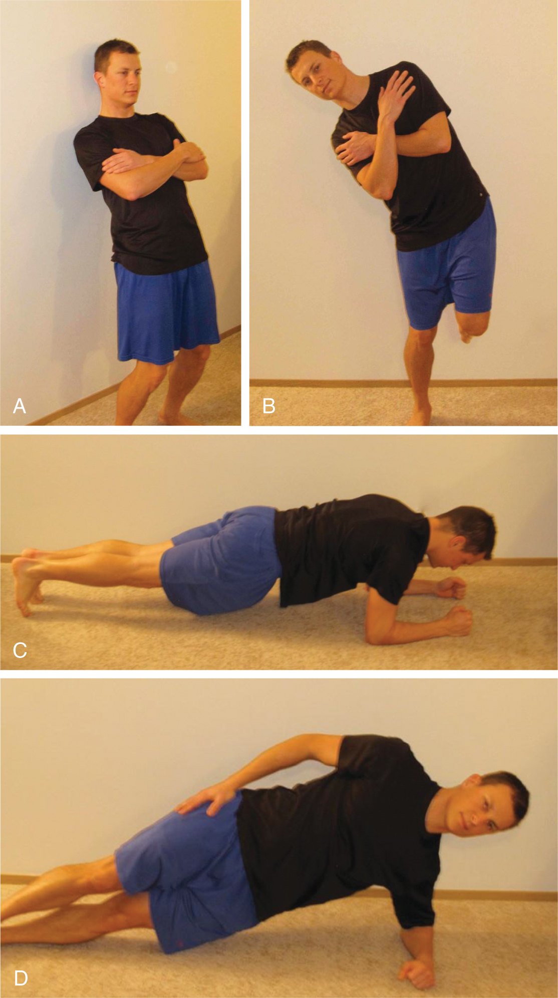 Hình 39.2 Đánh giá Chuỗi Động học Ví dụ về khám chuỗi động học bao gồm (A) đánh giá mặt phẳng dọc, (B) đánh giá mặt phẳng trán, (C) đánh giá tư thế plank, và (D) đánh giá tư thế side plank.