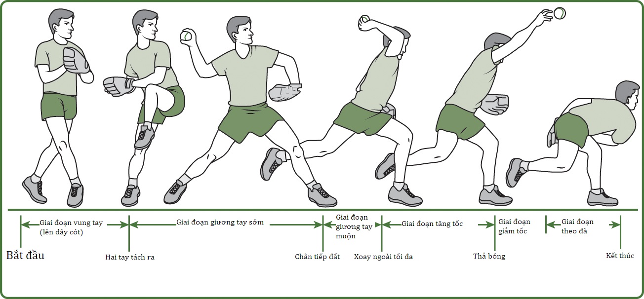 Lên tư thế bắt đầu khi người ném bóng bắt đầu chuyển động và kết thúc bằng việc nâng đầu gối tối đa của chân trước khi bóng được lấy ra khỏi găng tay. Đưa tay ra sau sớm bắt đầu khi chân sải mở rộng về phía người đánh bóng, cũng như đầu gối và hông của chân trụ, đẩy cơ thể về phía trước vào sải chân. Khi hông xoay về phía trước, thân mình theo sau, và sau đó vai ném dạng, duỗi và xoay ngoài, để lại vai ở tư thế bán chuẩn bị. Đưa tay ra sau muộn bắt đầu ở ~50 độ xoay ngoài và kết thúc ở ~175 độ tại điểm xoay ngoài tối đa. Trong giai đoạn tăng tốc, vai được xoay trong mạnh mẽ từ 175 độ xoay ngoài đến 90-100 độ khi thả bóng. Giảm tốc bắt đầu sau khi thả bóng và kết thúc khi cánh tay đạt 0 độ xoay trong. Giai đoạn cuối cùng là theo đà. [Sơ đồ các giai đoạn ném bóng chày]