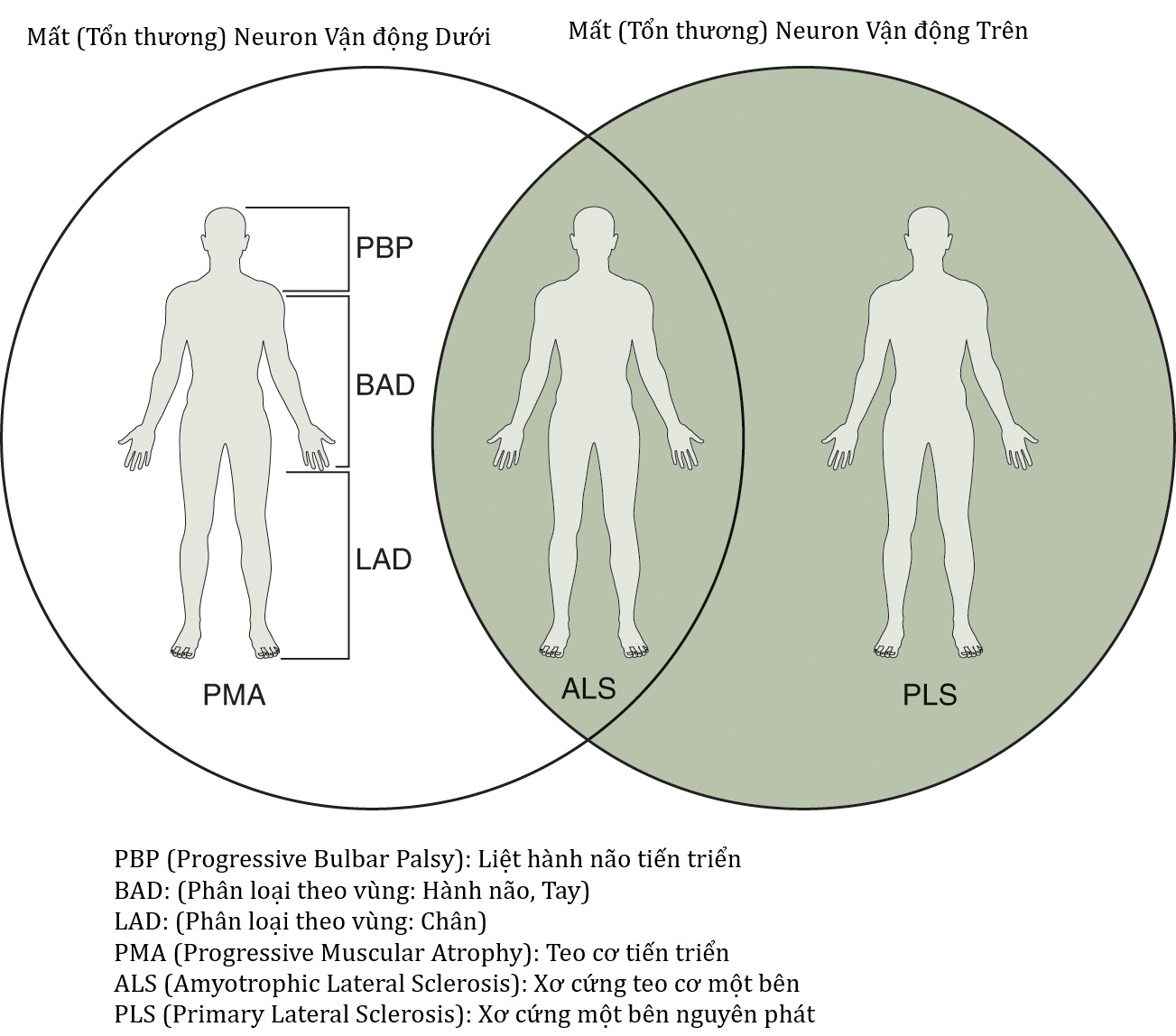 Hình 40.2 Phổ của Xơ cứng cột bên teo cơ và Biến thể Xơ cứng cột bên teo cơTeo cơ tiến triển (PMA), Xơ cứng cột bên nguyên phát (PLS), Liệt hành não tiến triển (PBP), Liệt teo cơ hai cánh tay (BAD), Liệt teo cơ hai chân (LAD).