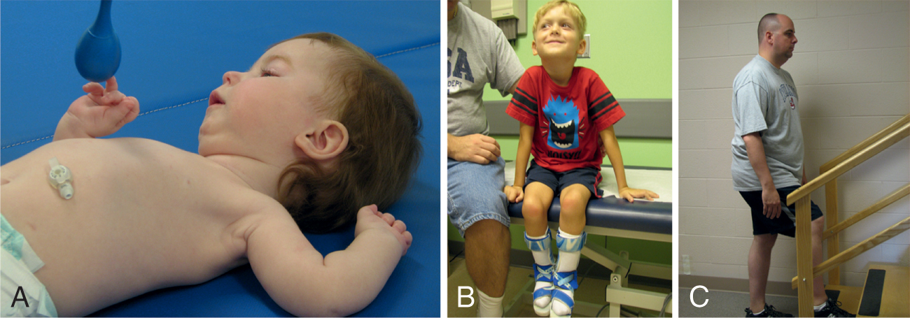 Hình 40.3 Các Phân nhóm của Teo cơ tủy (SMA) Gốc chi(A) SMA loại 1, dạng phổ biến nhất, khởi phát <6 tháng tuổi, và không bao giờ đạt được khả năng tự ngồi. (B) SMA loại 2 khởi phát trong khoảng 6 đến 18 tháng; đạt được khả năng tự ngồi, nhưng không thể đứng. SMA loại 3 có liên quan đến khởi phát >18 tháng, và bệnh nhân có thể đứng hoặc đi lại ít nhất là tạm thời. (C) SMA loại 4 là phân nhóm nhẹ nhất với khởi phát >30 tuổi. Loại 0 với khởi phát trước khi sinh không được hiển thị.