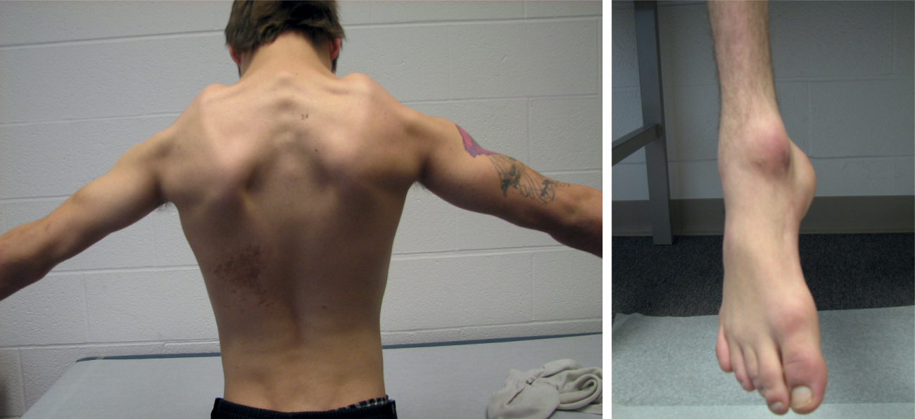 Hình 40.5. Một bệnh nhân có kiểu teo cơ quanh xương vai và cẳng chân xa bất thường liên quan đến dạng teo cơ tủy vai-mác (hội chứng Davidenkow) với sự tương đồng nổi bật với dạng thấy trong loạn dưỡng cơ mặt-vai-cánh tay.