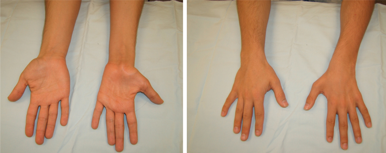 Hình 40.7. Teo cơ bàn tay và cẳng tay trái không đối xứng ở một bệnh nhân mắc bệnh Hirayama.