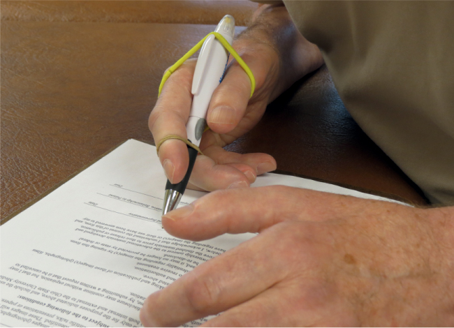 Hình 40.10. Yếu cơ nội tại bàn tay nghiêm trọng ở một bệnh nhân được chẩn đoán mắc bệnh xơ cứng cột bên teo cơ, người vẫn giữ được chức năng hành não và đi lại tương đối. Bệnh nhân không thể tự cầm bút để ký vào một mẫu chấp thuận.
