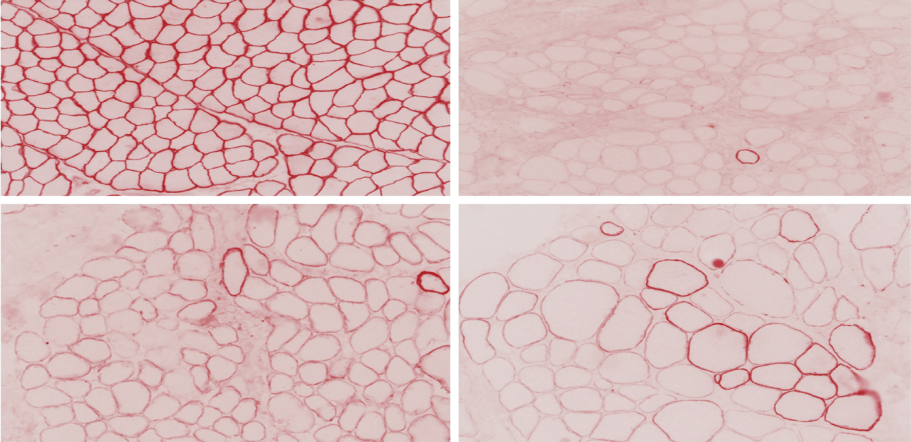CPK tăng nhẹ. EMG sẽ cho thấy một kiểu hình bệnh lý cơ. Mô bệnh học cơ cho thấy một kiểu hình loạn dưỡng với sự thay đổi kích thước sợi cơ, thay thế cơ bằng mô liên kết và tái tạo sợi cơ. Nhuộm Nicotinamide adenine dinucleotide (NADH) có thể cho thấy hình ảnh nhậy gặm (moth-eaten).