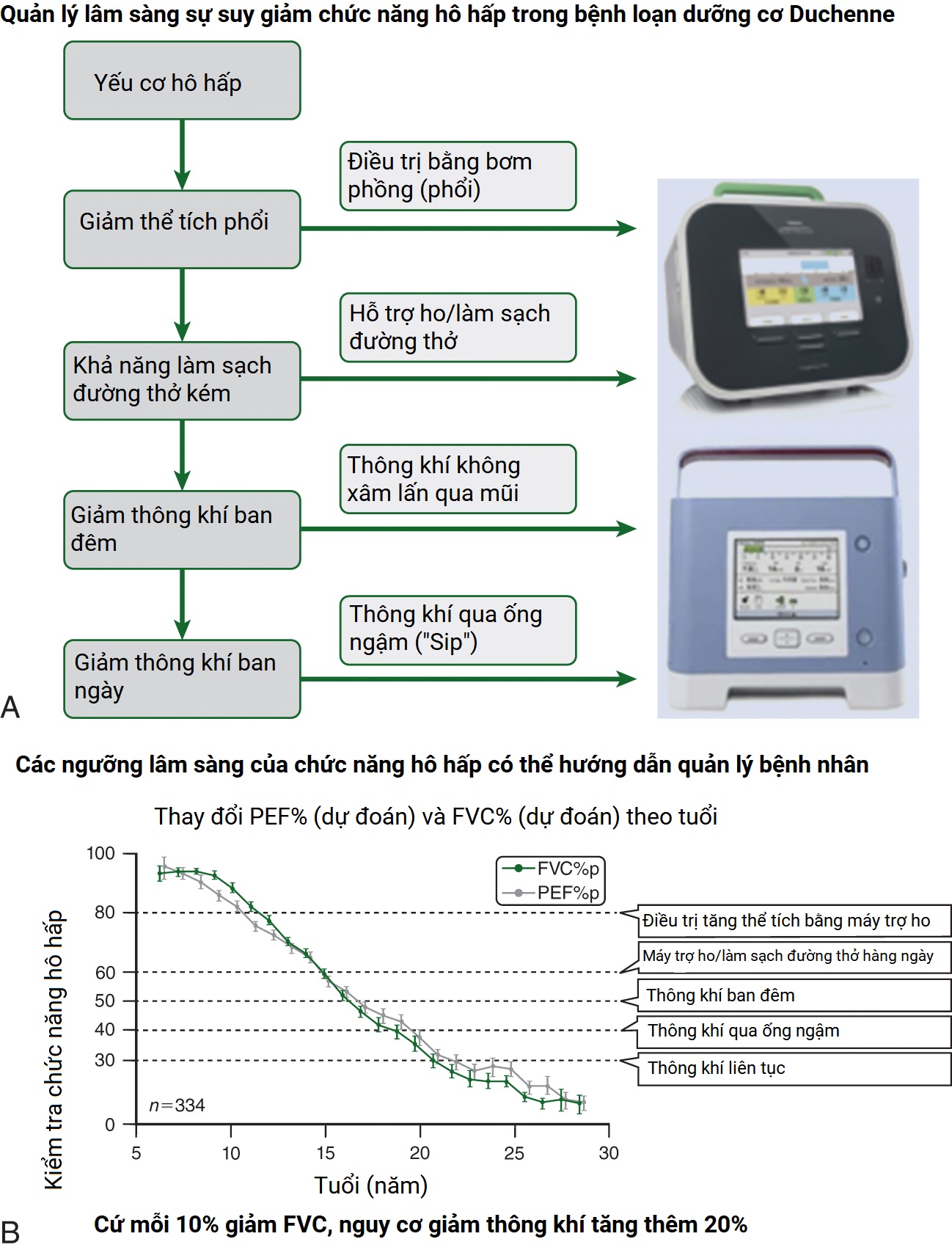Tỷ lệ giảm thông khí về đêm và tăng CO2 máu tăng lên khi bệnh tiến triển. Dung tích sống gắng sức (FVC) dưới 1 L là dấu hiệu của sự sống còn kém, với ước tính tỷ lệ sống sau 5 năm dưới 8%. Bắt đầu thông khí không xâm lấn (NIV) bằng áp lực đường thở dương hai mức (BiPAP) đã được chứng minh là cải thiện sự sống còn và bảo tồn năng lượng. Các chiến lược làm sạch đường thở có thể bắt đầu trong giai đoạn sớm đến cuối của giai đoạn không đi lại được để ngăn ngừa xẹp phổi, và việc bổ sung thông khí ban ngày có thể được chỉ định trong giai đoạn cuối không đi lại được. Thông khí xâm lấn bằng mở khí quản có thể được chỉ định trong tình trạng cấp tính nếu các phương pháp NIV đã thất bại hoặc trong tình trạng suy hô hấp mạn tính không đáp ứng với NIV 24 giờ bằng BiPAP. Oxy bị chống chỉ định trong bệnh lý đường thở hạn chế do bệnh lý cơ trừ khi có bệnh lý nhu mô phổi tiềm ẩn ảnh hưởng đến vận chuyển oxy qua các mô phổi.