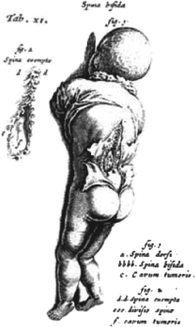 Hình 48.1 Bản phác thảo mô tả Spina Bifida, “Cột sống bị tách đôi”, của Nicolaes Tulp, một bác sĩ người Hà Lan (1641) (Hình ảnh phác thảo cổ về một trẻ sơ sinh bị tật nứt đốt sống hở ở lưng)