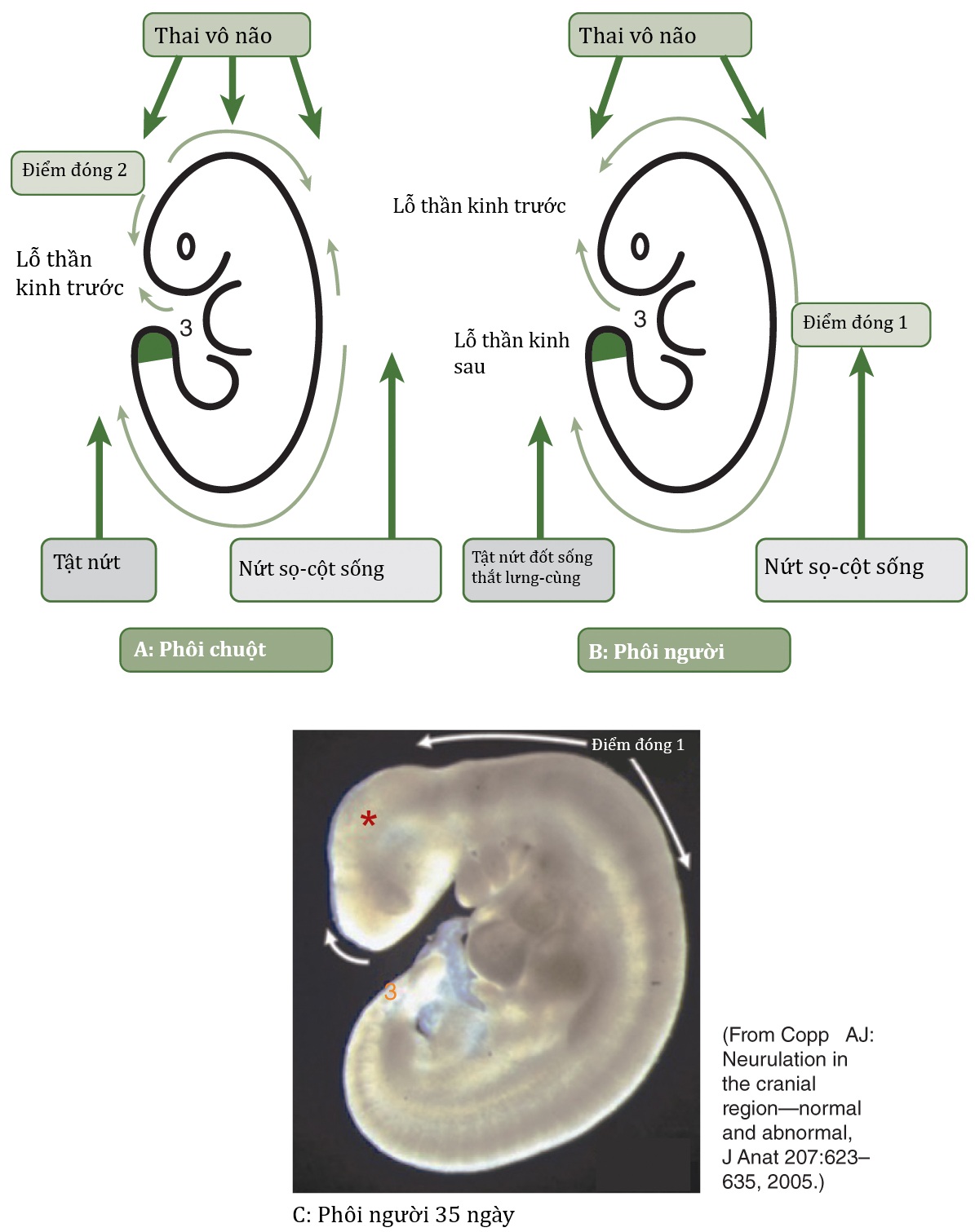 Quá trình hình thành thần kinh nguyên phát là sự phát triển của ống thần kinh, hình thành não và tủy sống. Quá trình hình thành thần kinh thứ phát là sự phát triển phần còn lại của ống thần kinh từ một khối tế bào ở đuôi lỗ thần kinh đuôi, hình thành các phần cùng và cụt dưới. Lỗ thần kinh đuôi đóng lại vào khoảng ngày thứ 26 của thai kỳ. NTDs là do sự thất bại của quá trình hình thành thần kinh trong khoảng từ ngày thứ 17 đến ngày thứ 30 của thai kỳ. Thất bại của quá trình hình thành thần kinh nguyên phát có thể dẫn đến NTDs hở.