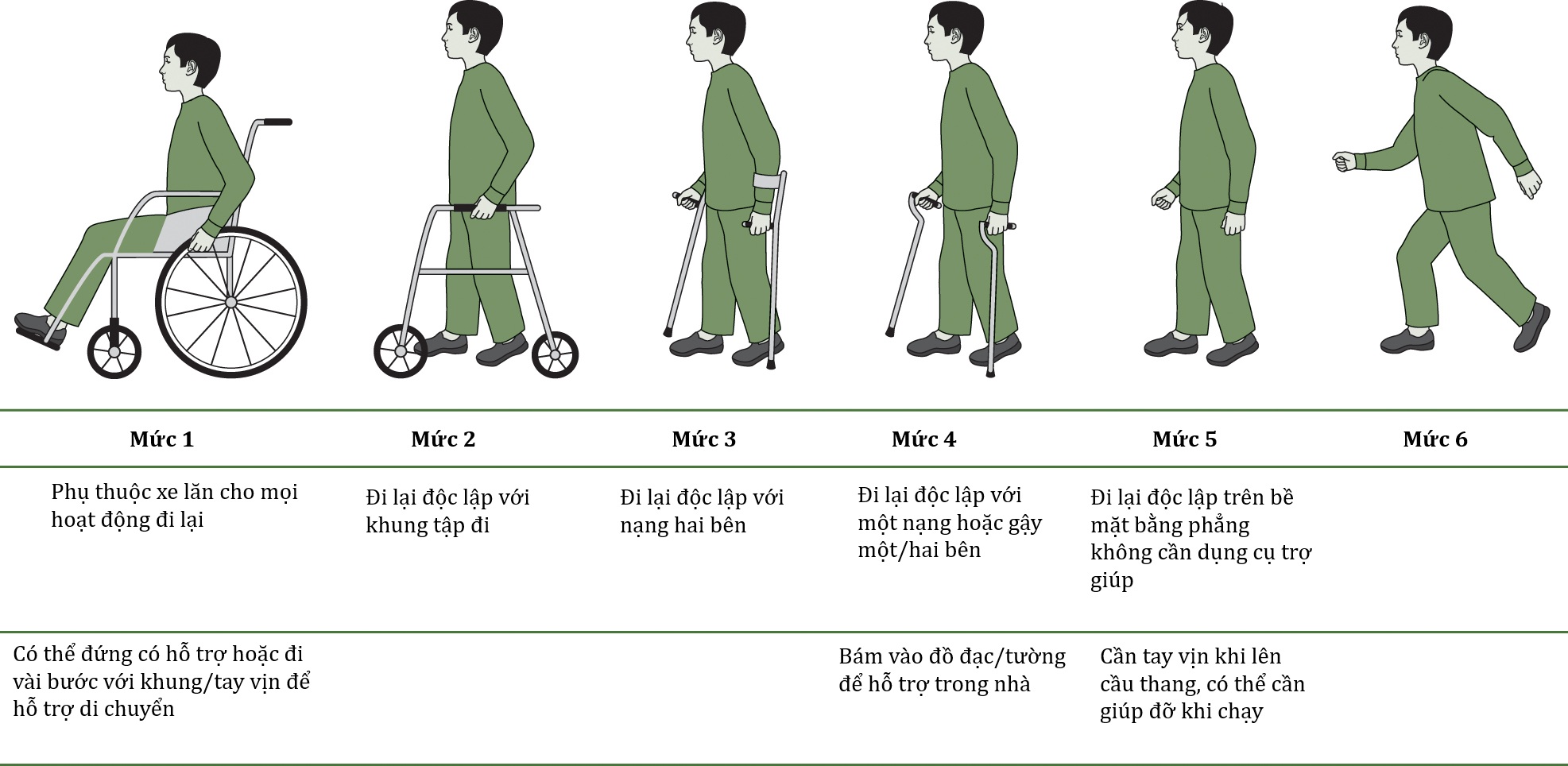 Khả năng đi lại sớm có lợi ích về sinh lý và tâm lý, mặc dù hầu hết trẻ em sẽ mất khả năng đó ở tuổi vị thành niên hoặc trưởng thành. Trẻ em tham gia các chương trình tập đi sớm có ít gãy xương và loét do tỳ đè hơn, và độc lập hơn. Khả năng đi lại dựa trên một số yếu tố bao gồm mức độ tổn thương, khả năng nhận thức, động lực, biến chứng cơ xương khớp, tăng trưởng, tuổi tác và béo phì. Chức năng đi lại, dựa trên tiêu chuẩn Hoffer, được phân loại là đi lại cộng đồng, đi lại trong nhà, đi lại tập thể dục hoặc không chức năng, và không đi lại/không đi bộ (Bảng 48.11). Sức mạnh cơ tứ đầu đùi, sức mạnh cơ thắt lưng chậu và khả năng đạt được tư thế ngồi độc lập là những yếu tố dự báo tiềm năng đi lại ở những bệnh nhân có mức độ tổn thương cao hơn. Thang đo Khả năng Vận động Chức năng (FMS) đánh giá khả năng chức năng ở 5 m (nhà), 50 m (trường học) và 500 m (cộng đồng) (Hình 48.12).