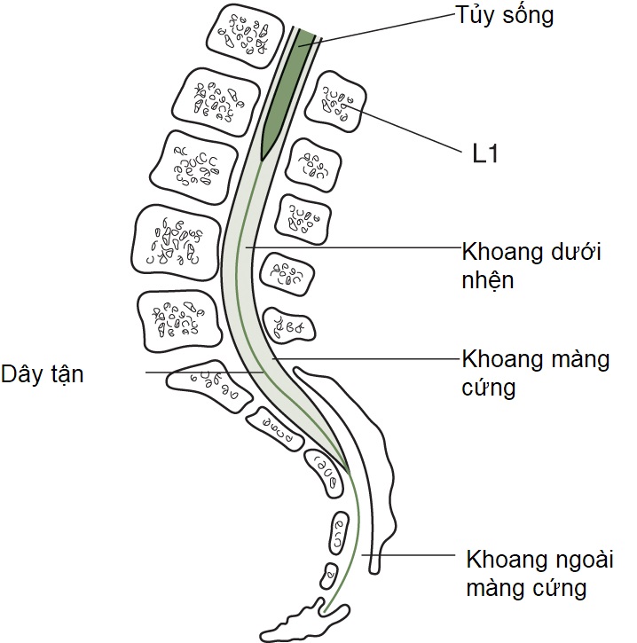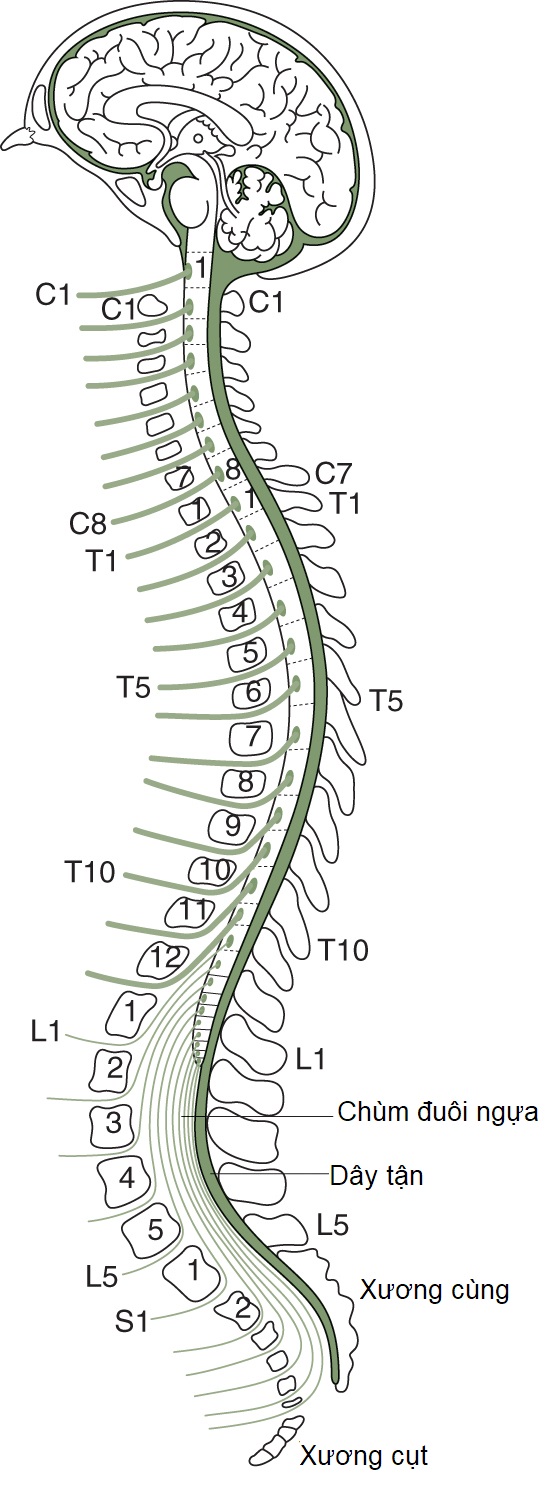 Tủy sống kết thúc ở ngang mức đĩa đệm L1 đến L2, và các đoạn tủy sống riêng lẻ không nhất thiết thẳng hàng với đốt sống tương ứng cùng số (Hình 49.1 trong Bảng 49.3). Phần cuối thon nhọn của tủy sống, hay nón tủy, chứa các đoạn tủy cùng. Các rễ thắt lưng-cùng trong ống sống ở đoạn xa nón tủy được gọi là chùm đuôi ngựa. Các màng tủy sống bao gồm màng nuôi, màng nhện và màng cứng. Khoang dưới nhện (hay khoang nội tủy) chứa dịch não tủy (CSF). Khoang ngoài màng cứng của cột sống là vùng giữa màng cứng và màng xương thân đốt sống (Hình 49.2 trong Bảng 49.3). Việc hiểu đầy đủ về giải phẫu của tủy sống và các mô hỗ trợ là rất quan trọng để chẩn đoán các nguyên nhân tổn thương nguyên phát và thứ phát (xem Bảng 49.3). Một nơ-ron vỏ não-tủy sống còn được gọi là nơ-ron vận động trên (UMN). Nó tiếp hợp với một nơ-ron vận động dưới (LMN), nơ-ron tiếp theo trong tủy sống thoát ra để chi phối cơ. Hội chứng UMN đề cập đến tổn thương UMN và LMN ở một vài mức đoạn tủy ở phía trên nón tủy và bao gồm mất vận động tự chủ, co cứng, tăng phản xạ, rung giật (clonus) và dấu hiệu Babinski dương tính. Nếu có một thành phần đáng kể của tổn thương LMN, mất vận động tự chủ mà không có các dấu hiệu UMN khác có thể xảy ra. Tổn thương LMN bao gồm các tổn thương mạch máu rộng, tổn thương nón tủy và tổn thương chùm đuôi ngựa. Một SCI cấp tính chủ yếu là UMN ban đầu sẽ không biểu hiện hội chứng UMN do sốc tủy, hay sự ức chế tạm thời hoạt động phản xạ dưới mức tổn thương, sau đó là sự trở lại dần dần của các phản xạ.