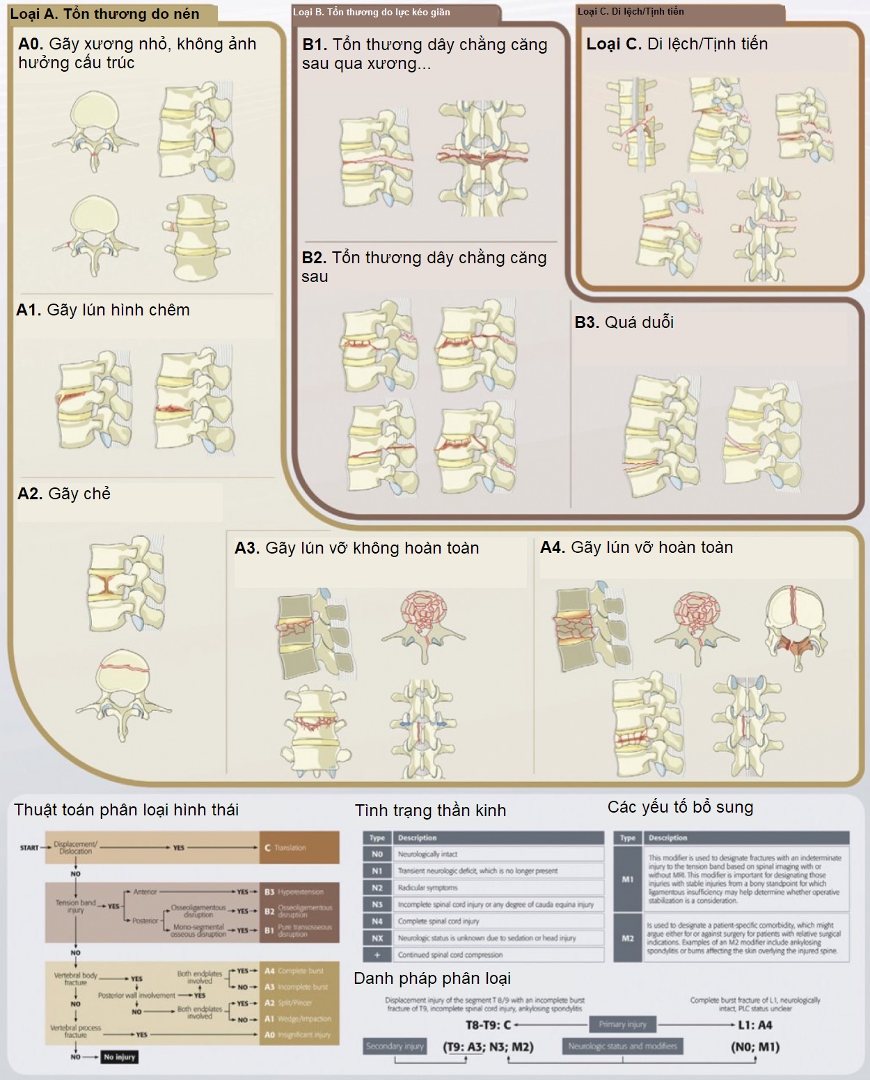 Mất ổn định cột sống đề cập đến việc cột sống không có khả năng duy trì mối quan hệ giải phẫu giữa các đốt sống dưới tải trọng sinh lý mà không ảnh hưởng tiêu cực đến tủy sống hoặc rễ thần kinh, không có đau đáng kể hoặc biến dạng do thay đổi cấu trúc. Mô hình ba cột (Hình 49.3 trong Bảng 49.4) thường được sử dụng để khái niệm hóa sự ổn định cột sống cho hầu hết các phần của cột sống (không bao gồm các đốt sống cổ trên). Cột sống có thể được coi là không ổn định khi hai cột liền kề bị tổn thương. Các hệ thống phân loại gãy cột sống khác tồn tại để chuẩn hóa các đánh giá và lập kế hoạch phẫu thuật như Hệ thống Phân loại Tổn thương Cột sống AOSpine (Hình 49.4 trong Bảng 49.5, và Hình 49.5 trong Bảng 49.6).