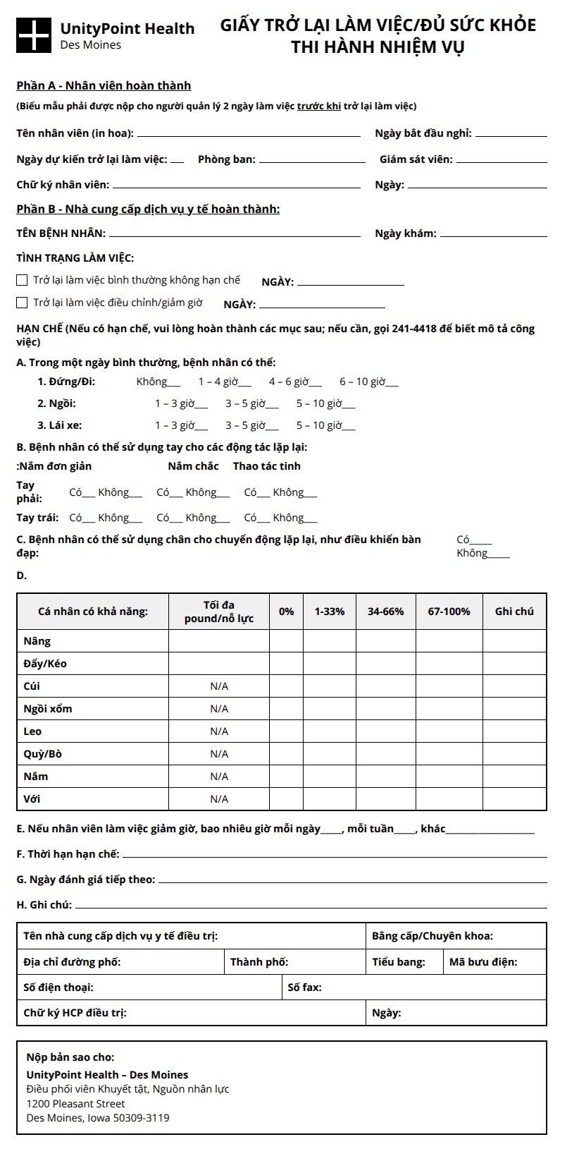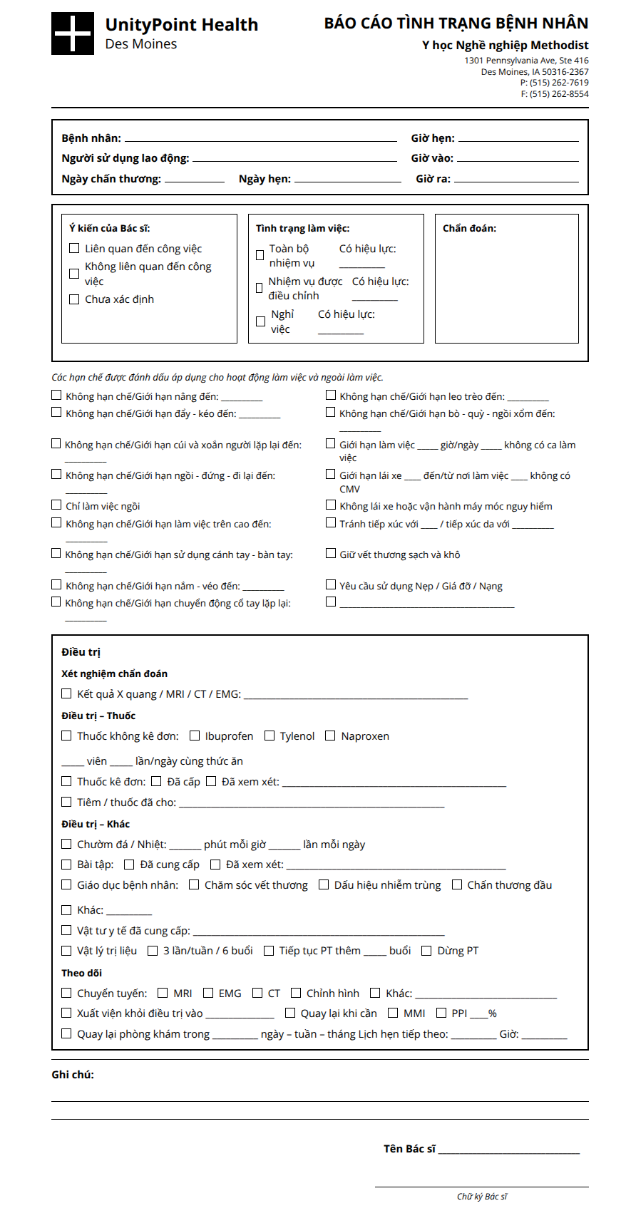 • Bác sĩ có thể được yêu cầu cung cấp một báo cáo tình trạng bệnh nhân và một biểu mẫu trở lại làm việc/đủ sức khỏe làm việc.