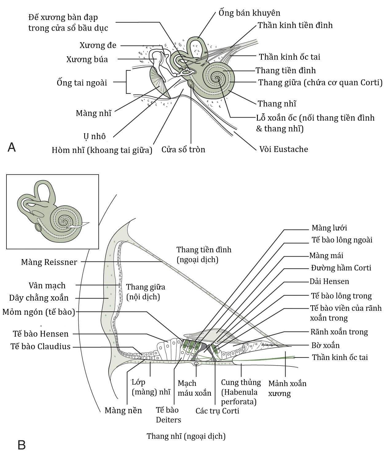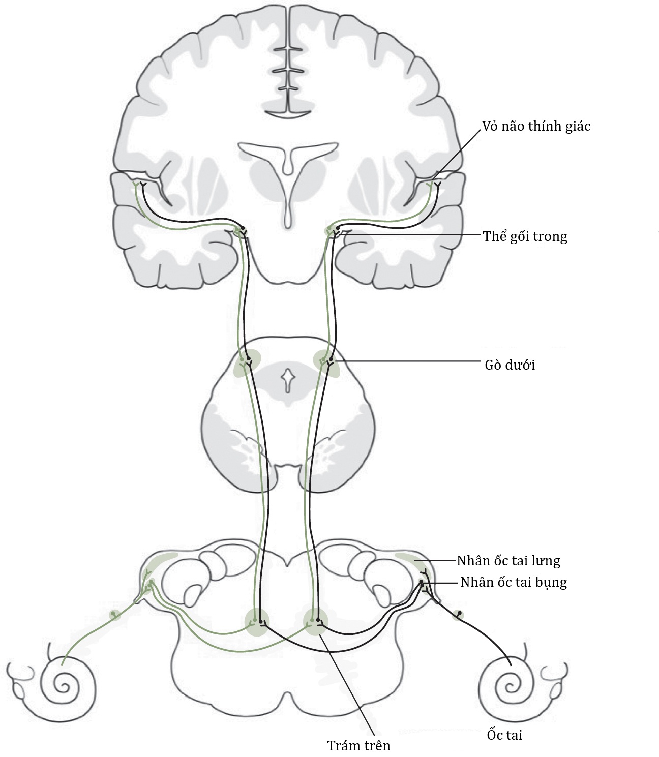 Âm thanh truyền đến tai giữa, nơi chứa hai cấu trúc tai chính: màng nhĩ và chuỗi xương con bao gồm xương búa, xương đe và xương bàn đạp (Hình 50.1). Âm thanh làm rung màng nhĩ, khiến chuỗi xương con chuyển động và khuếch đại âm thanh bằng cách sử dụng chuỗi xương con hoạt động như một bộ biến áp để khớp trở kháng. Tai trong là một không gian chứa đầy dịch lỏng bên trong xương thái dương và được kết nối với xương bàn đạp của chuỗi xương con qua cửa sổ bầu dục và với dây thần kinh sọ não số tám (dây thần kinh tiền đình-ốc tai) thông qua các tế bào lông (Hình 50.2; đường thính giác hướng tâm).