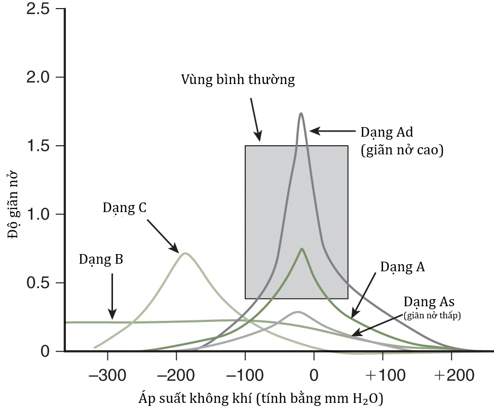 Đo nhĩ lượng, được thực hiện bằng một đầu dò cao su mềm được bịt kín trong ống tai ngoài, ghi lại những thay đổi về độ giãn nở hoặc độ cứng của tai giữa khi áp suất không khí trong ống tai ngoài thay đổi, thường là từ +200 daPa đến -300 daPa. Kết quả đo nhĩ lượng được biểu thị dưới dạng biểu đồ gọi là nhĩ lượng đồ (Hình 50.5). Có ba loại nhĩ lượng đồ chính: đo phản xạ cơ bàn đạp, đo âm ốc tai và đáp ứng thân não thính giác.