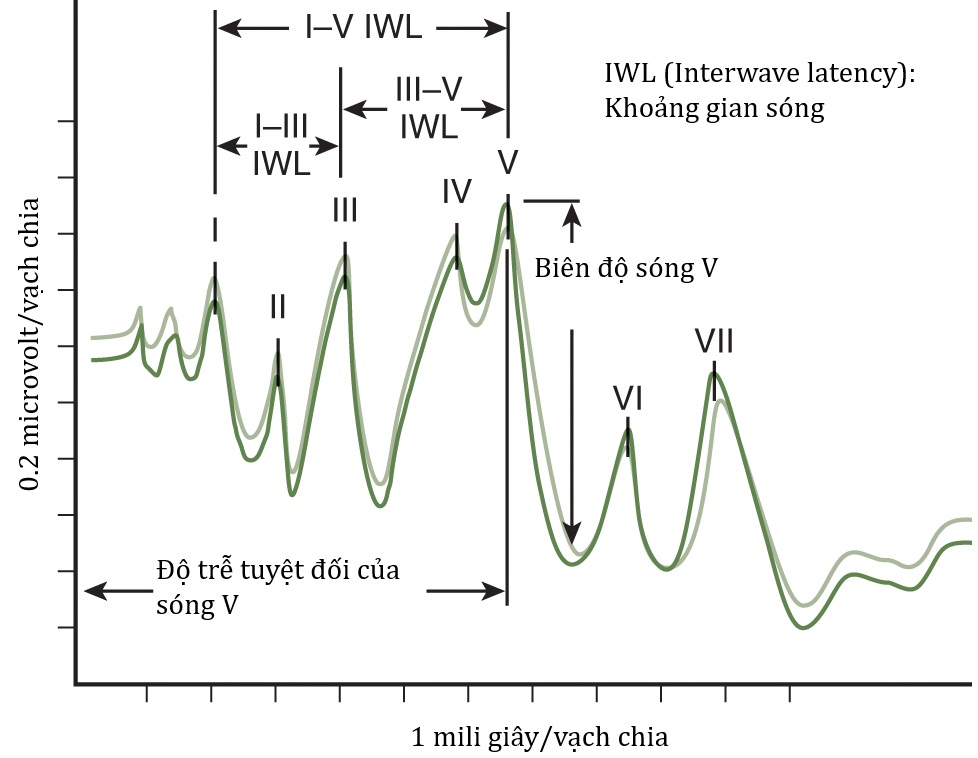 Đáp ứng thân não thính giác (Auditory brainstem response – ABR) đo lường các hoạt động thần kinh dọc theo đường dẫn truyền thính giác từ dây thần kinh sọ não số tám lên đến có thể là gò dưới (inferior colliculus) để đáp ứng với các kích thích thính giác được truyền qua tai nghe nhét trong. Các dạng sóng ABR được tạo ra do sự phóng điện đồng bộ của các nơ-ron và được sử dụng để phân tích. Ở người lớn có thính lực bình thường, ABR có bảy đỉnh sóng riêng biệt, được đánh dấu tuần tự từ I đến VII. Thông thường, chỉ các sóng I, III và V được sử dụng trên lâm sàng (Hình 50.6). ABR thường được áp dụng lâm sàng để ước tính khách quan các ngưỡng thính lực ở những bệnh nhân không thể tham gia đo thính lực đơn âm, bao gồm trẻ sơ sinh và trẻ nhỏ cũng như người lớn bị suy giảm nhận thức sau chấn thương sọ não.