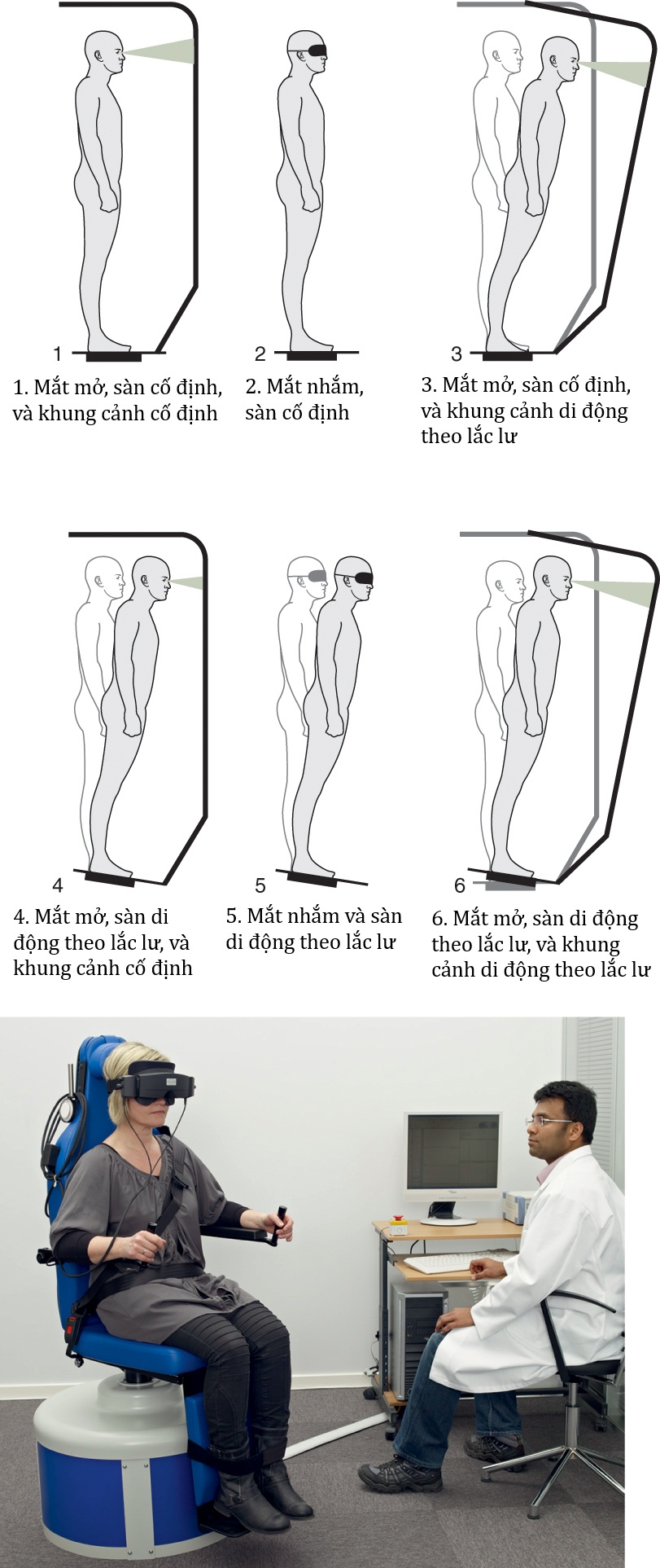 - Nghiệm pháp đo thăng bằng động vi tính (Computerized dynamic posturography – CDP) sử dụng một bệ di động và khung nhìn xung quanh. Các phản ứng vận động và sự ổn định tư thế của bệnh nhân được ghi lại khi bề mặt hỗ trợ và khung nhìn xung quanh di chuyển. Nghiệm pháp Tổ chức Cảm giác (Sensory Organization Test – SOT) và Nghiệm pháp Kiểm soát Vận động (Motor Control Test) là các thành phần của CDP. Hình 50.11 minh họa sáu điều kiện cảm giác của SOT.