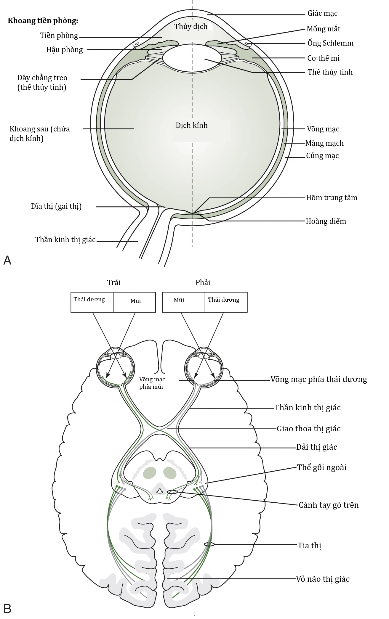 Thị giác liên quan nhiều nhất đến mắt; tuy nhiên, hệ thống thị giác của con người là một tập hợp phức tạp của các cấu trúc, kéo dài từ mắt trở lại vỏ não thị giác và sau đó về phía trước đến các khu vực liên hợp cảm giác, cũng như các khu vực vận động, trí nhớ, nhận thức, cảm xúc và các khu vực khác của não. Hình 50.12A minh họa các cấu trúc của nhãn cầu, và Hình 50.12B minh họa các đường dẫn truyền thị giác từ võng mạc đến vỏ não thị giác.