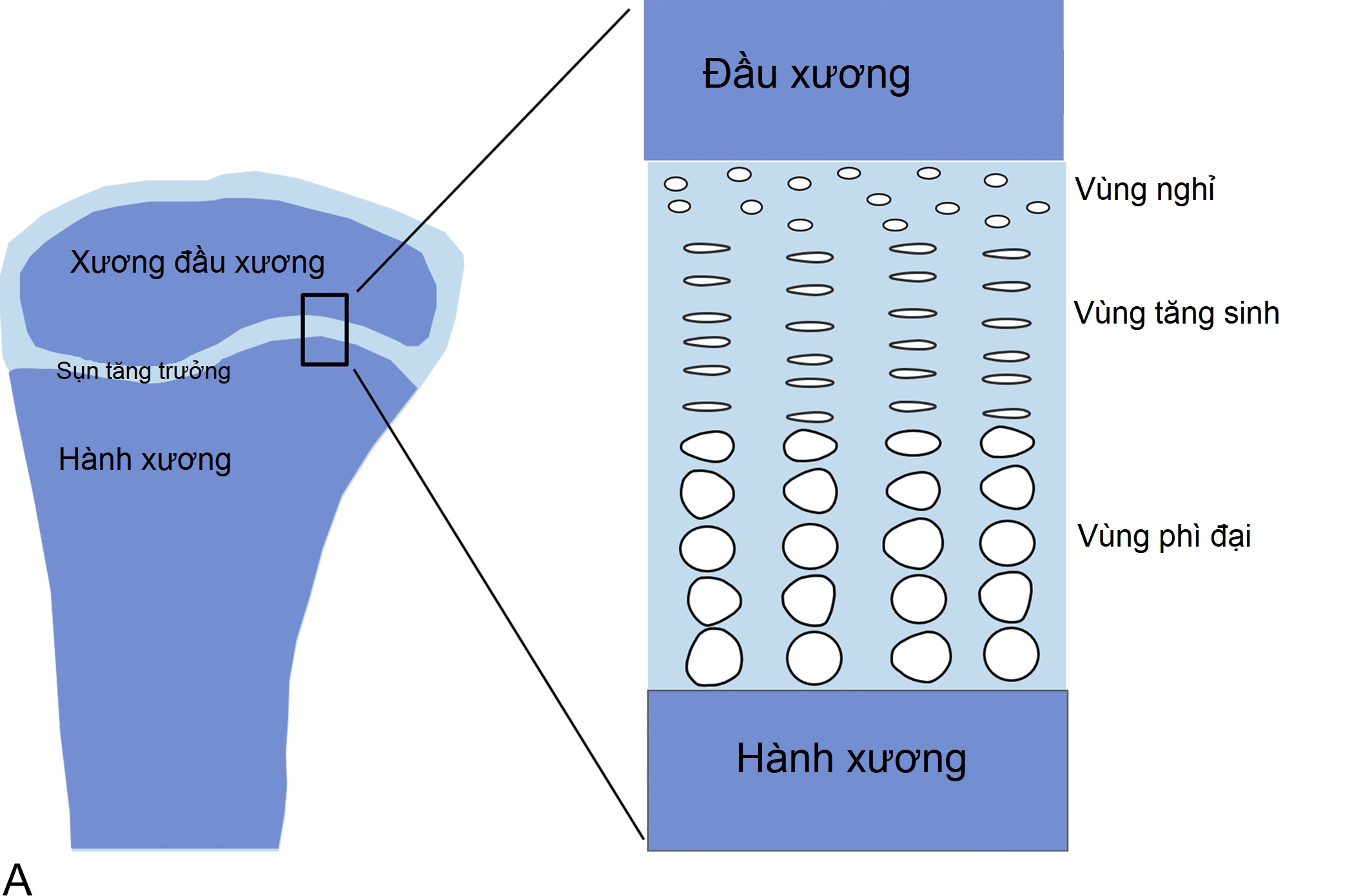 Hình 11.1A Cấu trúc sụn tăng trưởng. Ở trẻ em, sự tăng trưởng theo chiều dọc (tăng chiều cao) là kết quả của quá trình tạo sụn ở sụn tăng trưởng. Sụn tăng trưởng là một lớp sụn mỏng được tìm thấy gần các đầu xương dài và trong các đốt sống. Sụn tăng trưởng bao gồm ba vùng.