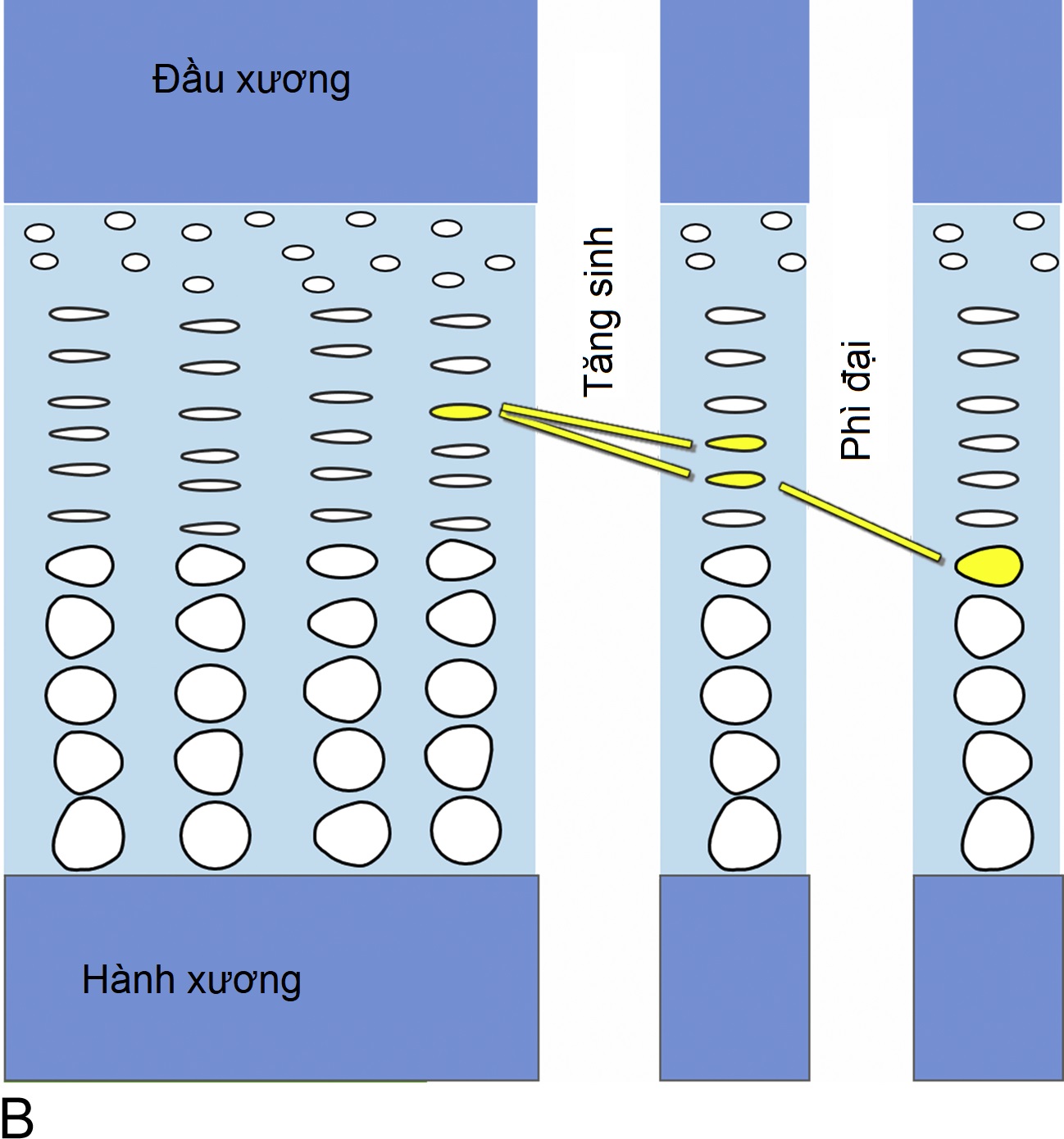 Hình 11.1B Chức năng của sụn tăng trưởng. Bên trong sụn tăng trưởng, các tế bào sụn trước tiên tăng sinh và sau đó phì đại. Kết quả là tạo ra nhiều sụn hơn (quá trình tạo sụn). Ở phần dưới của sụn tăng trưởng, sụn mới hình thành được tu sửa thành xương (không được hiển thị). Kết quả cuối cùng là xương mới được tạo ra ở phần dưới của sụn tăng trưởng, dần dần đẩy các đầu xương ra xa nhau, làm cho xương dài ra và trẻ cao lên.