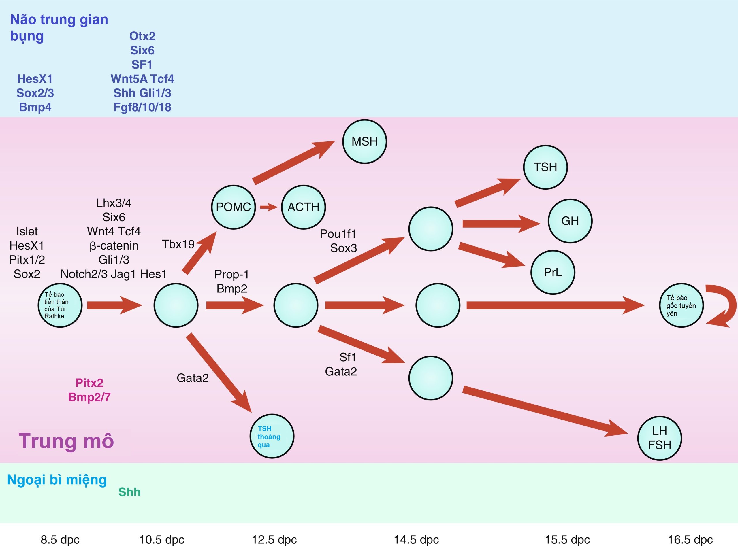 Hình 11.3 Sơ đồ biểu diễn chuỗi phát triển của các gen liên quan đến sự phát triển tuyến yên ở người với sự tham chiếu đặc biệt đến sự biệt hóa tế bào tuyến yên. (Từ Kelberman, D., Rizzoti, K., Lovell-Badge, R., và cộng sự. (2009). Genetic regulation of pituitary gland development in human and mouse. Endocr Rev, 30, 790–829.)