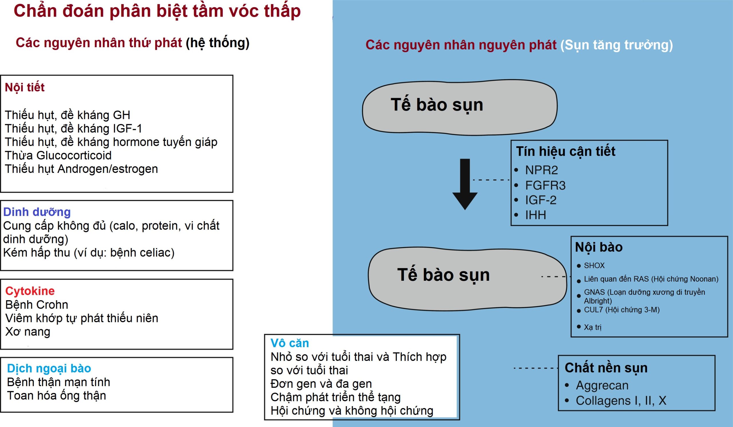 Do đó, sự tăng trưởng theo chiều dọc (tăng chiều cao) ở trẻ em là kết quả của quá trình tạo sụn ở sụn tăng trưởng. Vì vậy, tầm vóc thấp là do giảm quá trình tạo sụn ở sụn tăng trưởng và tầm vóc cao là do tăng quá trình tạo sụn ở sụn tăng trưởng.