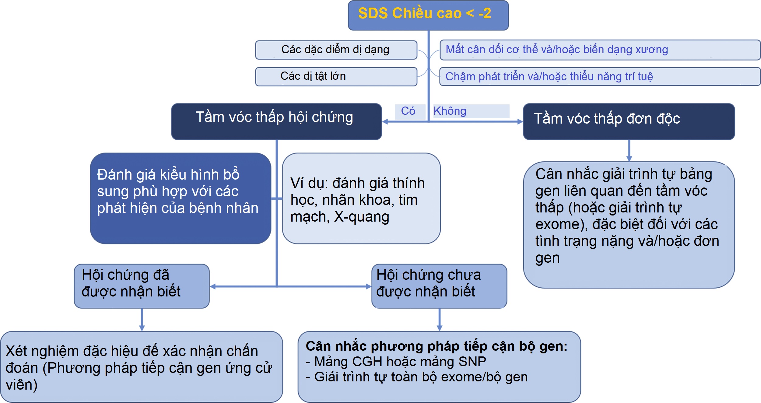Khi đó, nhân viên y tế được yêu cầu trả lời hai câu hỏi. Thứ nhất, tại sao sự tăng trưởng của trẻ lại nằm ngoài phạm vi bình thường và thứ hai, cần phải làm gì, nếu có. Câu hỏi đầu tiên, “tại sao,” rất quan trọng vì nhiều lý do. Nhiều trẻ em thấp hoặc cao vì chúng được di truyền từ cha mẹ một tập hợp lớn các đa hình bình thường khiến trẻ nằm ở một trong hai thái cực của phân bố chiều cao bình thường. Tình trạng tầm vóc thấp hoặc cao đa gen như vậy thường là lành tính. Tuy nhiên, một số trẻ thấp hoặc cao do bất thường một gen duy nhất có thể có những ảnh hưởng sức khỏe quan trọng, chẳng hạn như xu hướng dị tật tim hoặc các bệnh ác tính. Những trẻ khác bị thấp còi do một bệnh hệ thống mắc phải không rõ ràng, chẳng hạn như bệnh viêm ruột (IBD), viêm tuyến giáp tự miễn, hoặc khối u hệ thần kinh trung ương (CNS) gây rối loạn chức năng tuyến yên. Do đó, nhân viên y tế đánh giá sự tăng trưởng của trẻ em phải đối mặt với thách thức phân loại số ít trẻ có bệnh lý tiềm ẩn quan trọng khỏi số đông trẻ có tình trạng lành tính.