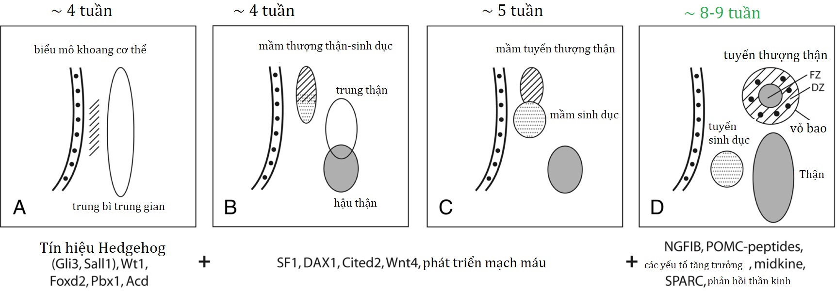 Hình 14.1: Tổng quan về sự phát triển tuyến thượng thận của người. A-C, Mầm tuyến thượng thận-sinh dục phát triển vào khoảng tuần thứ 4 của thai kỳ, sau đó mầm tuyến thượng thận trở thành một cấu trúc riêng biệt rồi di chuyển ra sau phúc mạc đến cực trên của trung thận. D, Đến tuần thứ 8 đến 9 của thai kỳ, tuyến thượng thận được bao bọc, chứa các tế bào ưa crôm (màu đen) và có các vùng bào thai (FZ) và vùng trưởng thành (DZ) riêng biệt. Một số phân tử tín hiệu, yếu tố phiên mã và yếu tố tăng trưởng liên quan đến sự phát triển của tuyến thượng thận được trình bày bên dưới, mặc dù thời gian chính xác và sự tương tác của nhiều yếu tố này hiện vẫn chưa được hiểu rõ.