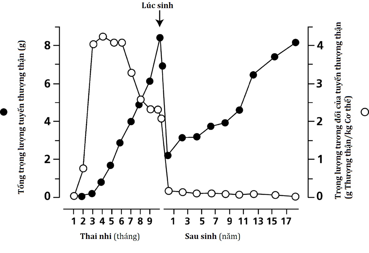 Hình 14.2: Tổng trọng lượng tuyến thượng thận (chấm tròn đen) và trọng lượng tương đối của tuyến thượng thận (vòng tròn trắng) từ ba tháng đầu thai kỳ cho đến khi trưởng thành sớm.