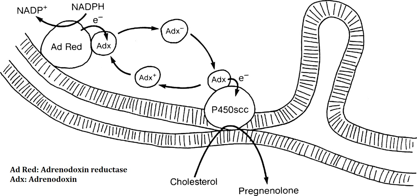 Các enzyme P450 ty thể (P450scc, P450c11β, P450c11AS, và các vitamin D 1α- và 24-hydroxylase) là các oxidase cuối cùng trong một hệ thống vận chuyển điện tử: NADPH tặng điện tử cho ferredoxin reductase (FDXR, còn được gọi là adrenodoxin reductase), một flavoprotein liên kết lỏng lẻo với màng trong ty thể. FDXR chuyển các điện tử đến ferredoxin (FDX, còn được gọi là adrenodoxin), một protein sắt/lưu huỳnh 14 kDa, sau đó chuyển các điện tử đến P450scc (Hình 14.4). FDX tạo thành một phức hợp 1:1 với FDXR, phân ly, sau đó tái tạo một phức hợp 1:1 tương tự với P450, do đó hoạt động như một cơ chế con thoi điện tử khuếch tán. FDXR và FDX được biểu hiện rộng rãi trong các mô của người, nhưng biểu hiện của FDXR cao hơn hai bậc độ lớn trong các mô sinh steroid. Bản phiên mã axit ribonucleic (RNA) chính từ gen FDXR được cắt nối luân phiên tạo ra hai loại RNA thông tin (mRNA) mã hóa các protein khác nhau sáu axit amin, nhưng chỉ có protein ngắn hơn mới hoạt động trong sinh tổng hợp steroid. FDXR cũng rất cần thiết trong việc hình thành các trung tâm sắt/lưu huỳnh được nhiều enzyme sử dụng. Có hai isozyme FDX ở người được mã hóa bởi các gen trên các nhiễm sắc thể khác nhau: FDX1 tương tác với các enzyme P450 ty thể; FDX2 được sử dụng để tổng hợp các cụm sắt-lưu huỳnh, nhưng không dùng cho sinh tổng hợp steroid. FDX1 được biểu hiện khắp nơi nhưng đặc biệt phong phú ở vỏ thượng thận. Các đột biến ở FDX ở người chưa được mô tả, nhưng một số đột biến FDXR làm suy giảm một phần sự hình thành các trung tâm sắt/lưu huỳnh có liên quan đến mất thính lực do bệnh lý thần kinh.