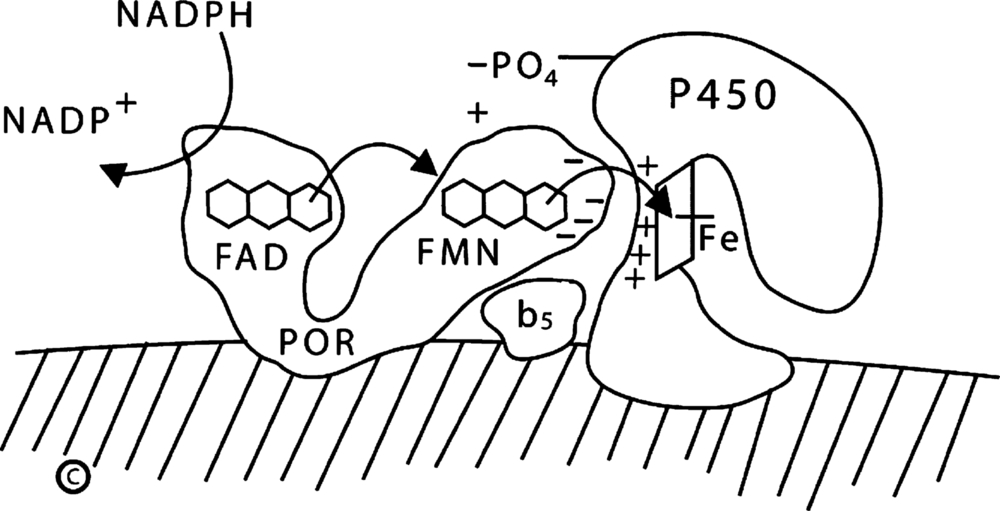 POR, một flavoprotein gắn màng không liên quan đến ferredoxin reductase ty thể, nhận điện tử từ NADPH và chuyển chúng đến 50 dạng cytochrome P450 ở vi thể, bao gồm P450c17, P450c21 và P450aro. Đối với phản ứng 17,20 lyase của P450c17, việc vận chuyển điện tử được tạo điều kiện bởi hoạt động của cytochrome b5, hoạt động như một yếu tố dị lập thể chứ không phải là một nhà tài trợ điện tử thay thế; hoạt động 17,20 lyase cũng được tăng lên bởi sự phosphoryl hóa serine/threonine của P450c17 bởi p38α, một protein kinase phụ thuộc cyclic adenosine monophosphate (cAMP) (Hình 14.5). Do đó, sự sẵn có của các điện tử quyết định liệu P450c17 chỉ thực hiện 17α-hydroxyl hóa hay còn thực hiện cả việc cắt liên kết 17,20: việc tăng tỷ lệ POR hoặc cytochrome b5 so với P450c17 làm tăng tỷ lệ hoạt động 17,20 lyase so với hoạt động 17α-hydroxylase. Do đó, sự điều hòa hoạt động 17,20 lyase, và do đó là sản xuất DHEA, phụ thuộc vào các yếu tố tạo điều kiện cho dòng điện tử đến P450c17: nồng độ POR cao, sự hiện diện của cytochrome b5, và sự phosphoryl hóa serine của P450c17.