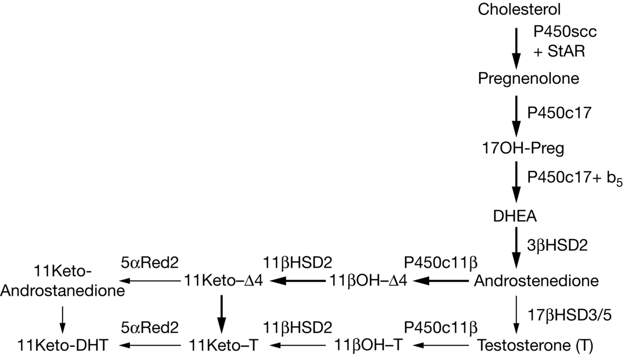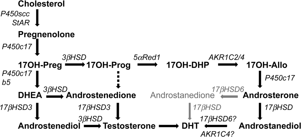 Khi pregnenolone được sản xuất từ cholesterol, nó có thể trải qua quá trình 17α-hydroxyl hóa bởi P450c17 để tạo ra 17-hydroxypregnenolone (17-Preg), hoặc nó có thể được chuyển đổi thành progesterone. Hai isozyme 42 kDa của 3β-hydroxysteroid dehydrogenase (3βHSD), được mã hóa bởi các gen HSD3B1 và HSD3B2, có thể xúc tác cho cả việc chuyển đổi nhóm hydroxyl thành nhóm keto ở carbon 3 và sự đồng phân hóa của liên kết đôi từ vòng B (steroid Δ5) sang vòng A (steroid Δ4). Các isozyme này có 93,5% tương đồng về trình tự axit amin và rất giống nhau về mặt enzyme: cả hai đều có thể chuyển đổi pregnenolone thành progesterone, 17-Preg thành 17α-hydroxyprogesterone (17OHP), DHEA thành androstenedione, và androstenediol thành testosterone. Tuy nhiên, 3βHSD2, isozyme được biểu hiện ở tuyến thượng thận và tuyến sinh dục, có hằng số Michaelis-Menten (Km) cao khoảng 5,5 μM, cao hơn khoảng 10 lần so với 3βHSD1 được biểu hiện ở nhau thai, não và các mô “ngoại tuyến”. Km thấp của 3βHSD1 ngoại tuyến cho phép nó tác động lên nồng độ thấp của một số steroid được tìm thấy trong tuần hoàn. Dữ liệu siêu cấu trúc cho thấy 3βHSD có thể được tìm thấy trong ty thể, mạng lưới nội chất và tế bào chất. Không rõ liệu sự phân bố dưới tế bào này có khác nhau ở các loại tế bào sinh steroid khác nhau hay không, nhưng đây có thể là một điểm điều hòa mới cho hướng đi của quá trình sinh tổng hợp steroid.