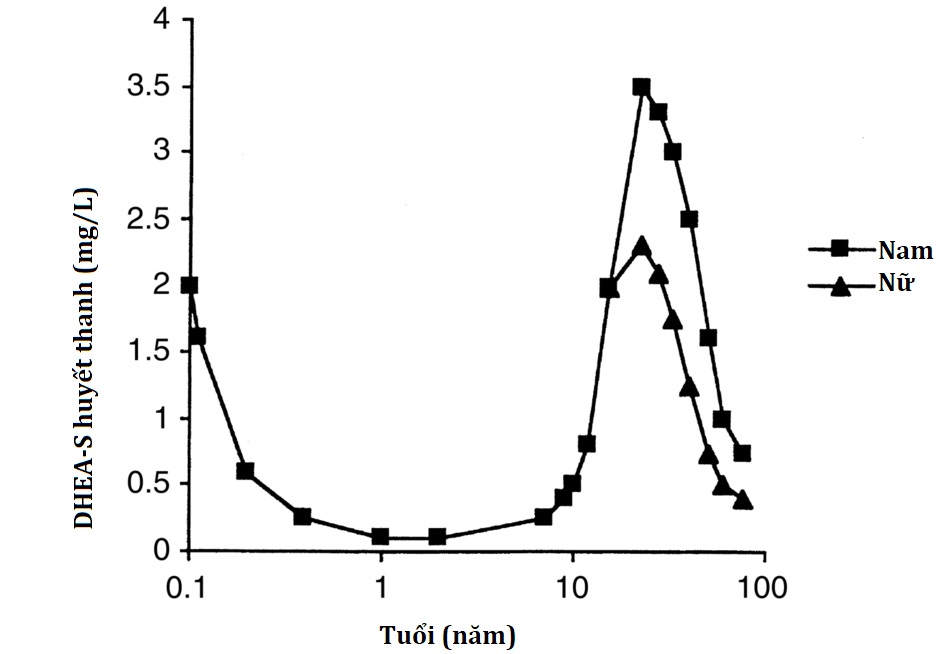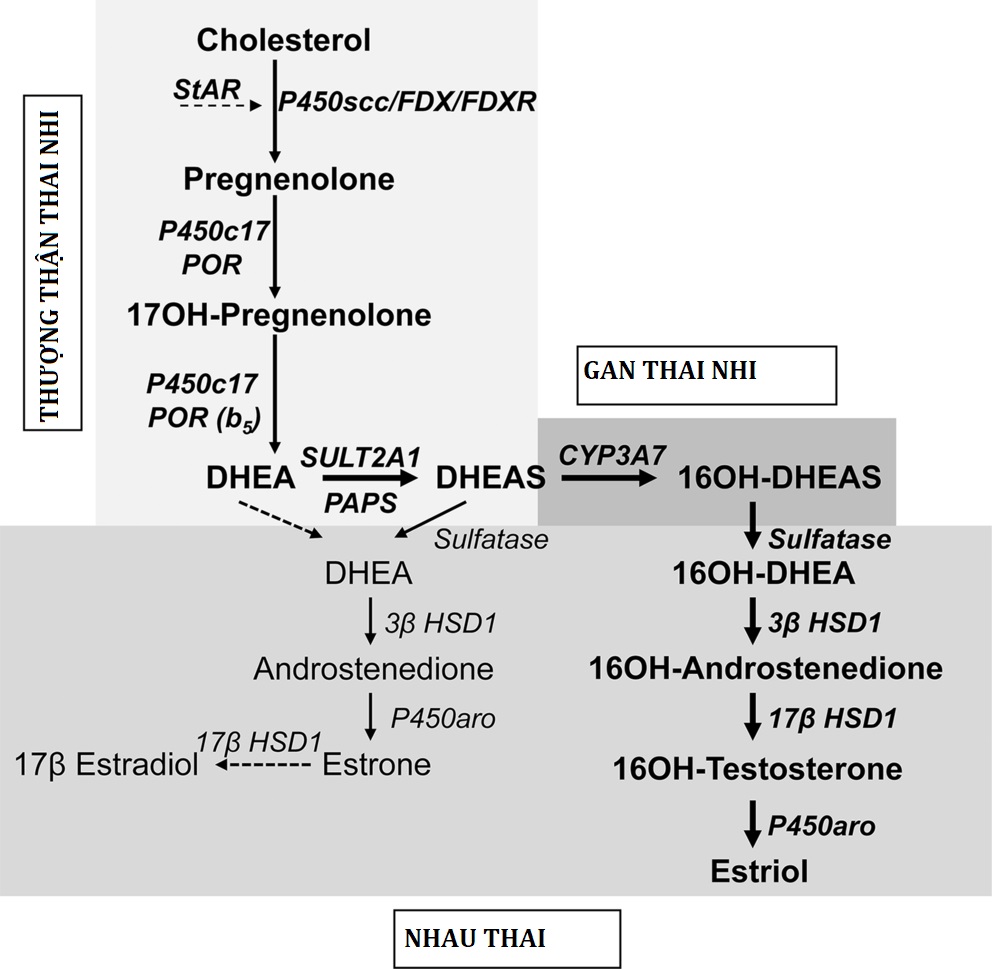 Estrogen được sản xuất bằng cách thơm hóa androgen, bao gồm cả androgen tuyến thượng thận, bằng một loạt các phản ứng phức tạp được xúc tác bởi aromatase, P450aro. Cytochrome P450 ở vi thể này được mã hóa bởi một gen duy nhất (CYP19A1) trên nhiễm sắc thể 15q21.1, sử dụng một số trình tự promoter, vị trí bắt đầu phiên mã và các exon đầu tiên được chọn lựa thay thế khác nhau để mã hóa P450aro giống hệt nhau ở các mô khác nhau dưới sự điều hòa hormone khác nhau. Biểu hiện của Aromatase ở các mô ngoại tuyến, đặc biệt là mô mỡ, có thể chuyển đổi androgen tuyến thượng thận thành estrogen. Aromatase ở các đầu xương của xương đang phát triển chuyển đổi testosterone thành estradiol; tầm vóc cao, sự trưởng thành đầu xương chậm và loãng xương ở nam giới bị thiếu hụt aromatase, và sự đảo ngược nhanh chóng của chúng khi thay thế estrogen cho thấy rằng estrogen, chứ không phải androgen, chịu trách nhiệm cho sự trưởng thành đầu xương ở nam giới.