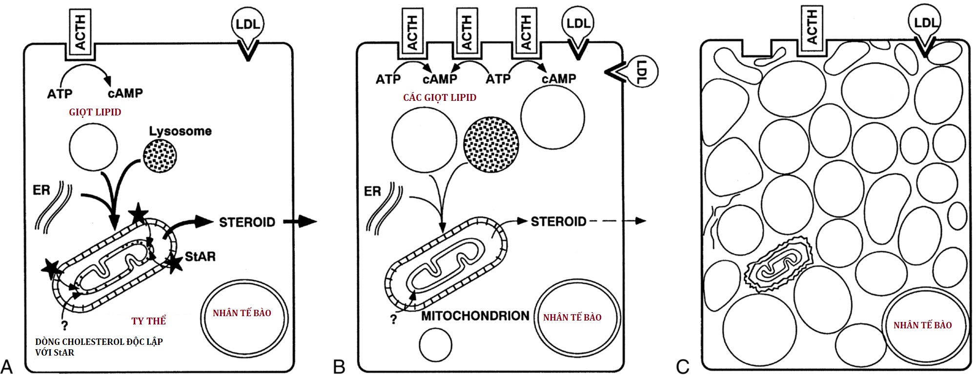 Hiện nay, chúng ta đã biết nhiều về sinh tổng hợp steroid và về các bước ban đầu trong quá trình vận chuyển cholesterol nội bào. Tuyến thượng thận của người có thể tự tổng hợp cholesterol từ acetate, nhưng phần lớn nguồn cung cấp cholesterol đến từ lipoprotein tỷ trọng thấp (LDL) trong huyết tương có nguồn gốc từ cholesterol trong chế độ ăn. Tuyến thượng thận của loài gặm nhấm lấy hầu hết cholesterol từ lipoprotein tỷ trọng cao thông qua một thụ thể được gọi là SR-B1, nhưng con đường này đóng vai trò nhỏ trong sinh tổng hợp steroid ở người. Nồng độ LDL đủ sẽ ức chế 3-hydroxy-3-methylglutaryl co-enzyme A (HMG-CoA) reductase, enzyme giới hạn tốc độ trong quá trình tổng hợp cholesterol. ACTH, chất kích thích sinh tổng hợp steroid tuyến thượng thận, cũng kích thích hoạt động của HMG-CoA reductase, các thụ thể LDL, và sự hấp thu cholesterol LDL. Các este cholesterol LDL được hấp thu bởi quá trình nhập bào qua trung gian thụ thể, sau đó được dự trữ trực tiếp hoặc chuyển đổi thành cholesterol tự do và được sử dụng để tổng hợp hormone steroid. Cholesterol có thể được este hóa bởi acyl-CoA:cholesterol transferase (ACAT), được lưu trữ trong các giọt lipid, và được tiếp cận bằng cách kích hoạt lipase nhạy cảm với hormone (HSL) và bởi các protein được gọi là NPC, có tên gọi bắt nguồn từ vai trò gây bệnh Niemann-Pick type C. ACTH kích thích HSL và ức chế ACAT, do đó làm tăng sự sẵn có của cholesterol tự do để tổng hợp hormone steroid.