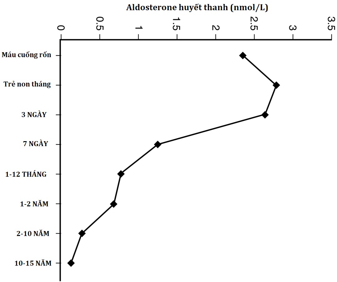 Vỏ thượng thận của thai nhi bao gồm một vùng “xác định” bên ngoài, là nơi chính tổng hợp glucocorticoid và mineralocorticoid, và một vùng “bào thai” lớn hơn nhiều, tạo ra các tiền chất androgen (dehydroepiandrosterone [DHEA], dehydroepiandrosterone sulfate [DHEAS]) mà nhau thai chuyển đổi thành estriol. Một vùng “chuyển tiếp” được cho là tồn tại giữa các vùng này vào cuối quá trình phát triển của thai nhi, nhưng vai trò của nó chưa rõ ràng. Tuyến thượng thận của thai nhi rất lớn so với các cấu trúc khác và tiếp tục phát triển cho đến ba tháng cuối thai kỳ (Hình 14.2). Khi sinh ra, tuyến thượng thận nặng từ 8 đến 9 g, có kích thước tương đương với tuyến thượng thận của người trưởng thành và chiếm khoảng 0,4% tổng trọng lượng cơ thể. Sau khi sinh, các tế bào của vùng bào thai trải qua quá trình apoptosis, và vùng thượng thận của thai nhi nhanh chóng thoái triển và gần như biến mất hoàn toàn sau 6 đến 12 tháng tuổi. Sau đó, sự phát triển của tuyến thượng thận tương đối chậm, do đó tuyến thượng thận chỉ chiếm 0,01% trọng lượng cơ thể ở người trưởng thành.