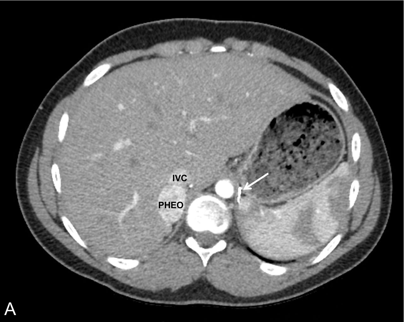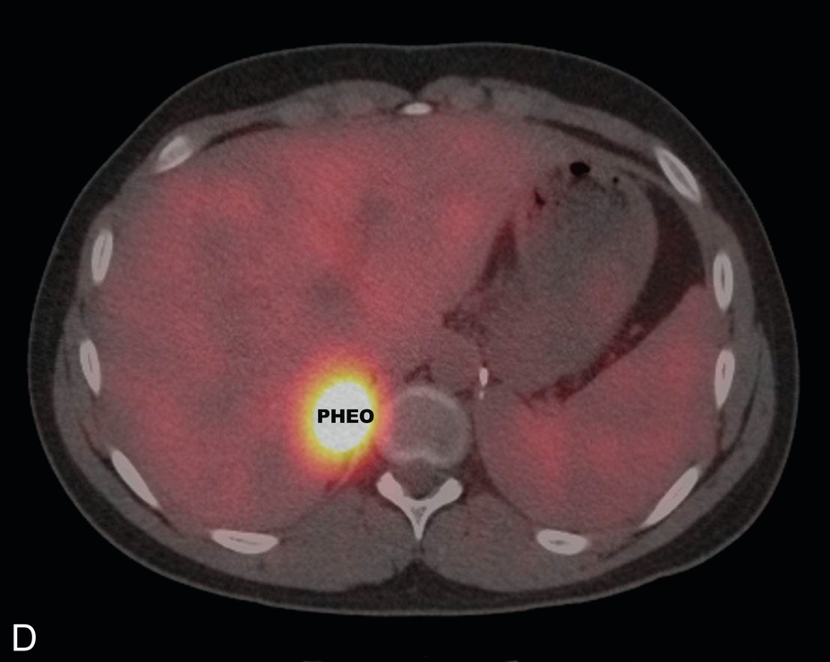 Hình 15.1 Một bệnh nhi nam 14 tuổi, huyết áp bình thường, mắc bệnh von Hippel-Lindau và có tiền sử u tế bào ưa crôm bên trái và u cận hạch thần kinh ở bụng được chẩn đoán lúc 7 tuổi, được phát hiện có nồng độ normetanephrin tăng cao sau khi tầm soát. (A) Chụp cắt lớp vi tính (CT) có cản quang, mặt cắt ngang và (B) tái tạo mặt cắt đứng, đã xác định một khối u tân sinh giàu mạch máu phát sinh từ cực trên của tuyến thượng thận phải (mũi tên, kẹp phẫu thuật từ lần cắt tuyến thượng thận trước). Xạ hình Metaiodobenzylguanidine (MIBG) đã xác nhận bản chất chức năng của khối u và loại trừ các khối u đồng bộ khác. (C) Hình ảnh phẳng và (D) hình ảnh hợp nhất CT/SPECT cắt ngang ở cùng bệnh nhân, 24 giờ sau khi tiêm 123I MIBG. IVC, tĩnh mạch chủ dưới; PHEO, u tế bào ưa crôm.