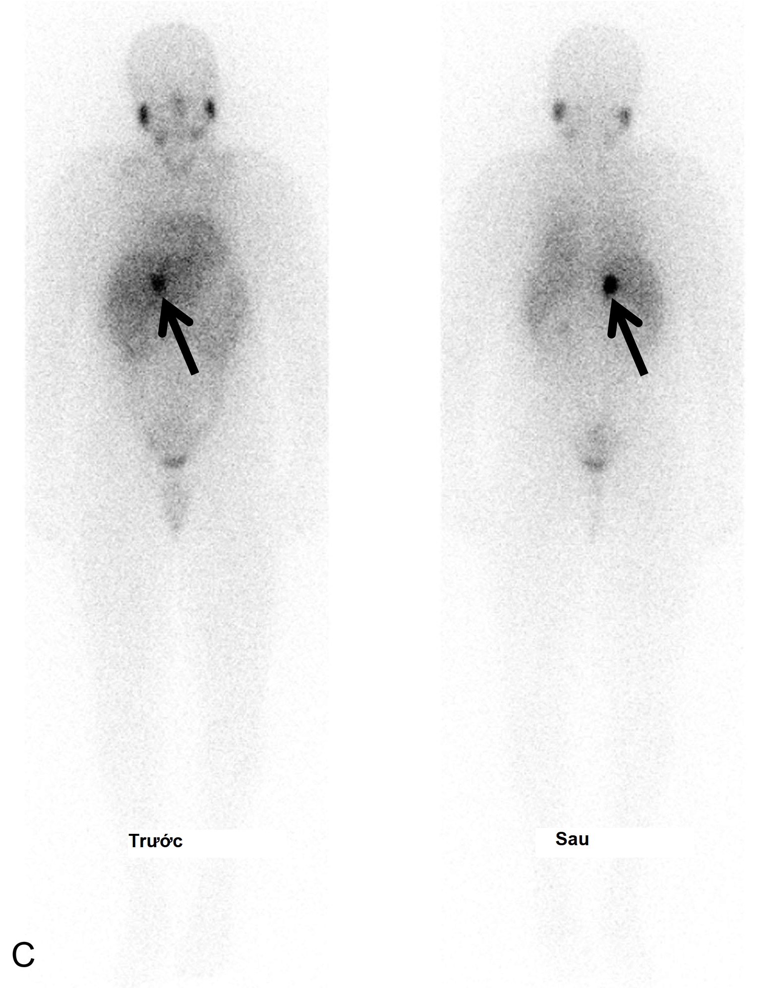 Y học hạt nhân, hay hình ảnh chức năng, có thể hữu ích trong một số trường hợp nhất định để chẩn đoán PHEO/PGL (đặc biệt để xác nhận chẩn đoán ở một khối u ngoài thượng thận) hoặc để đánh giá bệnh nhân về bệnh đa ổ hoặc di căn, đặc biệt ở những bệnh nhân có các yếu tố nguy cơ ác tính và kiểu hình noradrenergic. Có một số phương pháp xạ hình y học hạt nhân có thể hữu ích. Metaiodobenzylguanidine (MIBG) là một hợp chất tổng hợp có cấu trúc tương tự norepinephrine (ngoại trừ nó cũng có một chuỗi bên guanidine chống lại sự chuyển hóa), và nó tích tụ ưu tiên trong các mô adrenergic, chủ yếu do sự tái hấp thu qua hệ thống vận chuyển norepinephrine. MIBG được sử dụng cho mục đích chẩn đoán được đánh dấu phóng xạ bằng 123I hoặc 131I, mặc dù 123I MIBG là tác nhân được lựa chọn vì các đặc tính hình ảnh vượt trội và liều bức xạ thấp hơn đáng kể vì nó không phải là một chất phát tia β. Xạ hình 123I MIBG (xem Hình 15.1) có thể xác nhận bản chất sản xuất catecholamin của một khối u, định vị các khối u không nhìn thấy bằng hình ảnh cắt lớp, và có khả năng xác định các vị trí bệnh khác, mặc dù độ nhạy của nó không cao và do đó việc sử dụng nó bị hạn chế vì lý do này, trừ khi đang xem xét điều trị bằng 131I-MIBG cho bệnh di căn. Trước khi xạ hình 123I-MIBG, cần cẩn thận để đảm bảo rằng bệnh nhân không dùng các loại thuốc (ví dụ, thuốc thông mũi, thuốc chẹn kênh canxi, hoặc labetalol) được biết là làm giảm sự hấp thu MIBG, và nên dùng kali iodua để ngăn chặn sự hấp thu iốt phóng xạ của tuyến giáp. Do những hạn chế của xét nghiệm MIBG, việc sử dụng các phương thức hình ảnh hạt nhân khác kết hợp chụp cắt lớp phát xạ positron (PET) với hình ảnh CT đã trở nên phổ biến hơn, đặc biệt là [18F] fluorodeoxyglucose (FDG) PET/CT và 68Ga-DOTATATE PET/CT (xem Hình 15.2). 68Ga-DOTATATE PET/CT đã trở thành phương thức hình ảnh chức năng được lựa chọn, do tính đặc hiệu của nó đối với các thụ thể somatostatin thường được tìm thấy trên các khối u thần kinh nội tiết, chẳng hạn như PHEO/PGL và độ nhạy vượt trội của nó so với FDG-PET/CT và xạ hình 123I-MIBG.