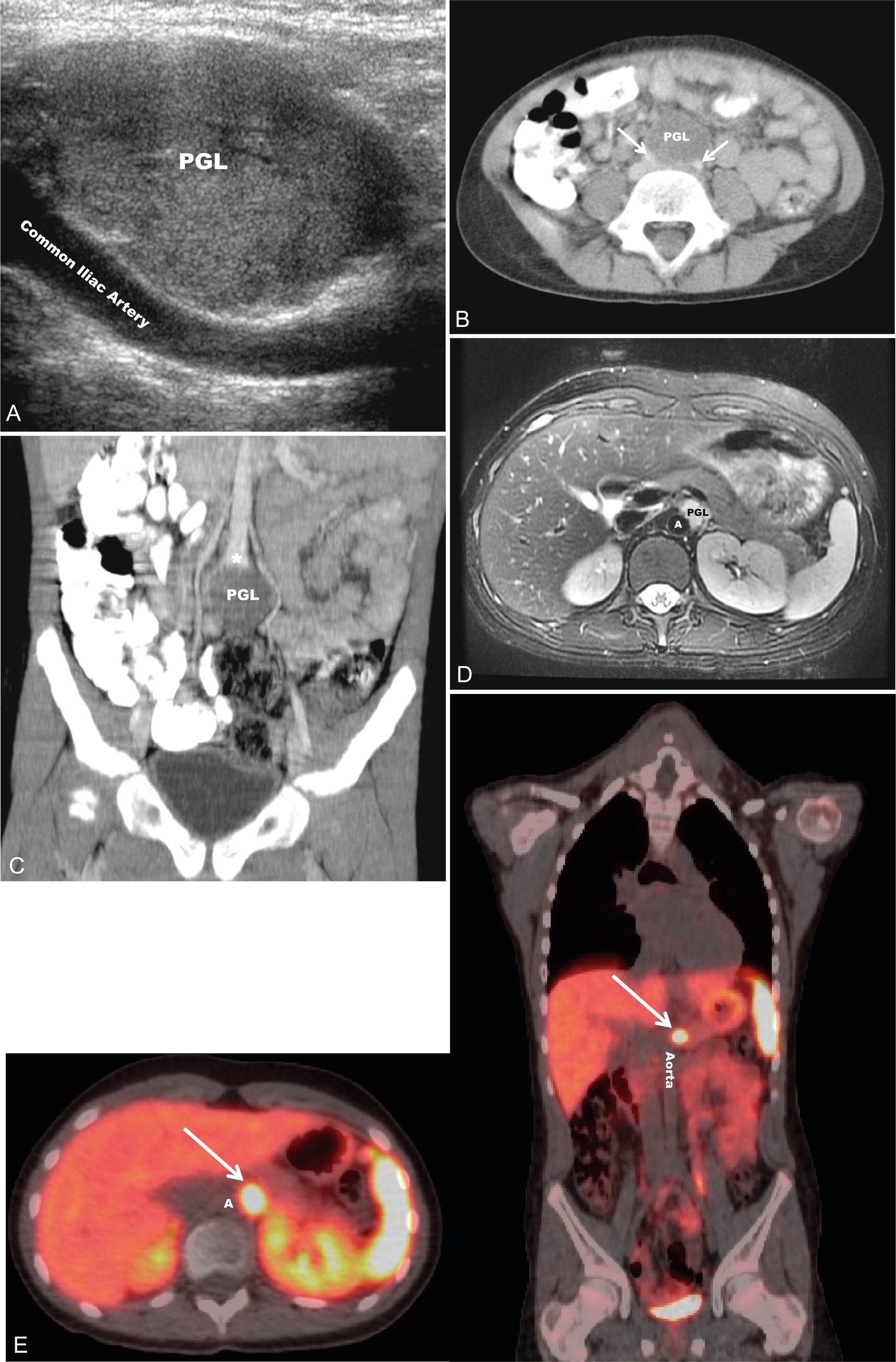 Hình 15.2 Một bệnh nhi nữ 6 tuổi có u cận hạch thần kinh (PGL) và đột biến SDHB, biểu hiện với tăng huyết áp nặng trong một buổi khám sức khỏe định kỳ. (A) Siêu âm bụng (mặt cắt dọc) cho thấy một khối u 3,3 cm đồng nhất, tăng sinh mạch bên cạnh các động mạch chậu chung. (B) Chụp cắt lớp vi tính (CT) có cản quang, mặt cắt ngang (mũi tên, các động mạch chậu chung) và (C) tái tạo mặt cắt đứng, xác nhận một khối u ở vị trí phân đôi động mạch chủ (dấu sao). Một bệnh nhi nam 13 tuổi có đột biến SDHB bị tăng huyết áp và nồng độ norepinephrine, normetanephrin, và chromogranin A bất thường trong quá trình tầm soát định kỳ. (D) Hình ảnh T2-weighted cắt ngang từ chụp cộng hưởng từ bụng cho thấy một khối u 2 cm cạnh động mạch chủ (PGL) giữa gốc động mạch thân tạng và động mạch mạc treo tràng trên, có tín hiệu T2 tăng cao. Điều này sau đó đã được xác nhận là một u cận hạch thần kinh (mũi tên) thông qua hình ảnh chức năng với chụp cắt lớp phát xạ positron/CT 68Ga-DOTATATE (E). A, động mạch chủ. Common Iliac Artery = Động mạch chậu chung, Aorta = Động mạch chủ