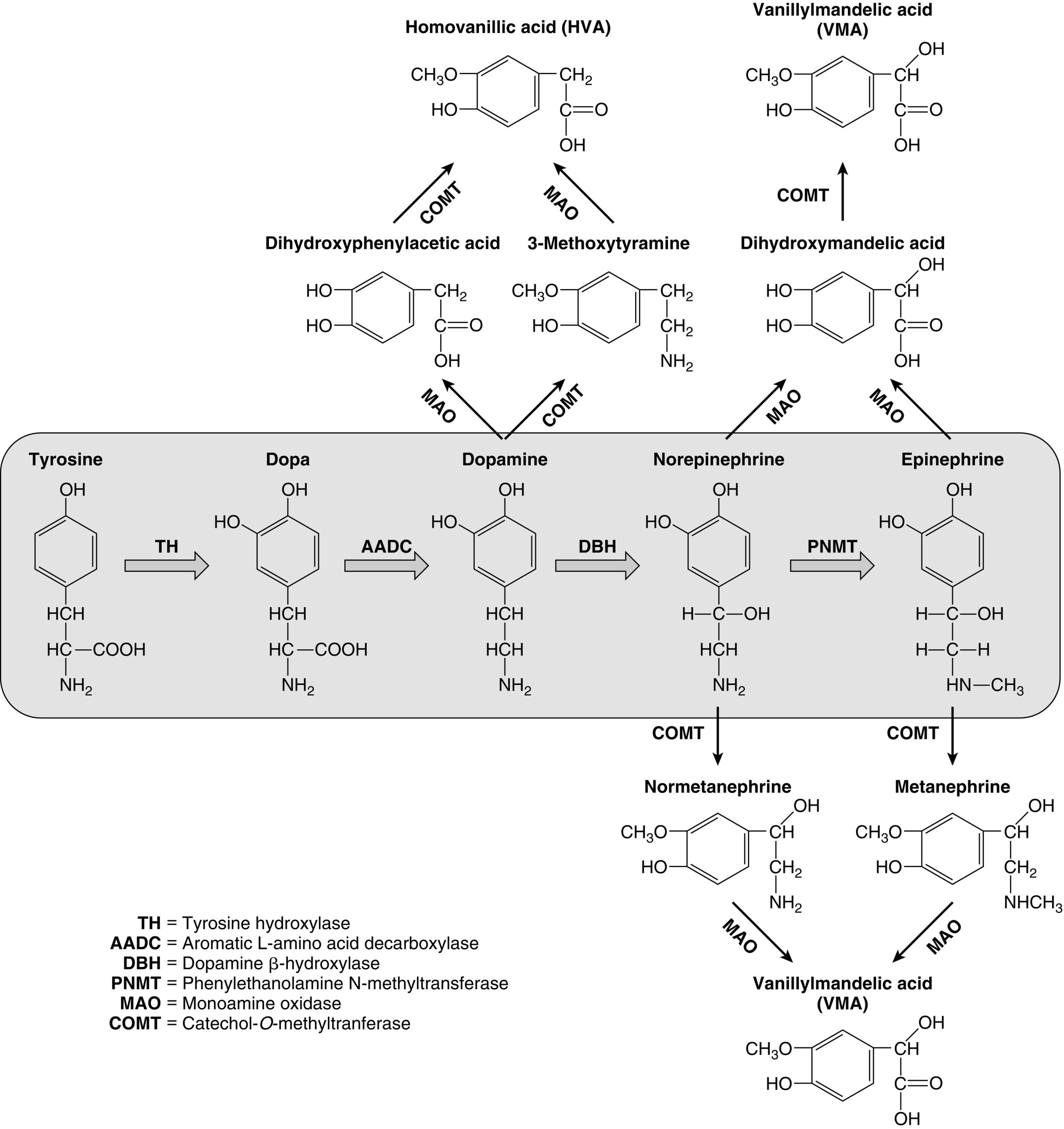 Hình 15.3 Các catecholamin được tổng hợp từ axit amin tyrosine, được chuyển đổi thành 3,4-dihydroxyphenylalanine (dopa) bởi enzyme tyrosine hydroxylase (TH), đây là bước giới hạn tốc độ trong quá trình sinh tổng hợp catecholamin. Các quá trình khử carboxyl (aromatic L-amino acid decarboxylase; AADC) và hydroxyl hóa (dopamine β-hydroxylase; DBH) sau đó tạo ra dopamine và norepinephrine tương ứng, và norepinephrine sau đó được chuyển đổi thành epinephrine thông qua enzyme cytosolic phenylethanolamine N-methyltransferase (PNMT). Các catecholamin được chuyển hóa bởi hai enzyme chính: monoamine oxidase (MAO) và catechol-O-methyltransferase (COMT).