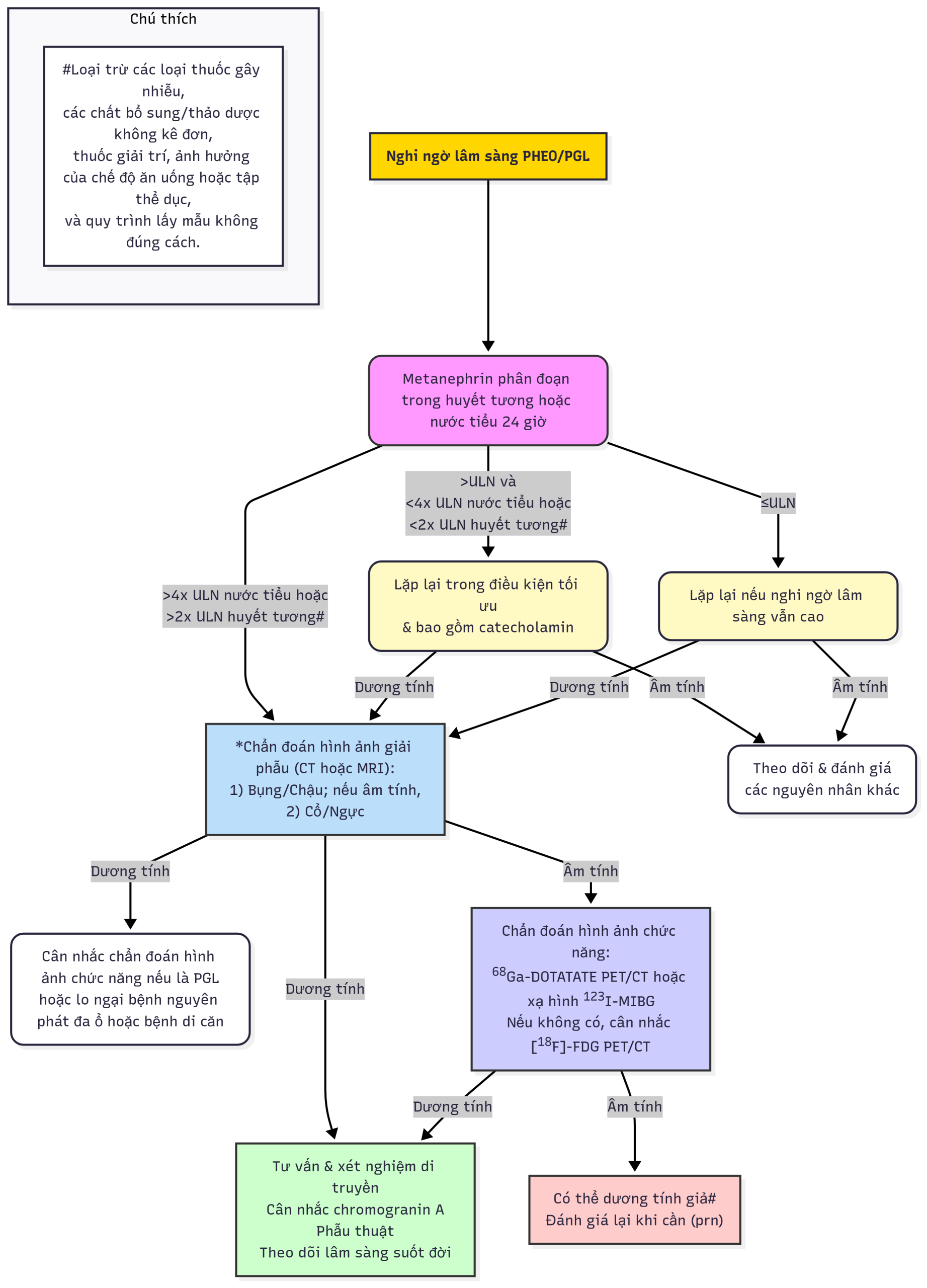 Chẩn đoán PHEO/PGL đã được đơn giản hóa nhờ những tiến bộ trong các phương pháp xét nghiệm được sử dụng để phát hiện và định lượng nồng độ catecholamin và các chất chuyển hóa của chúng trong máu và nước tiểu. Việc đo lường metanephrin phân đoạn trong huyết tương và/hoặc nước tiểu (metanephrin và normetanephrin) là xét nghiệm nhạy nhất (độ nhạy gần 100%) để chẩn đoán PHEO/PGL và nên là xét nghiệm chẩn đoán chính (Hình 15.4).