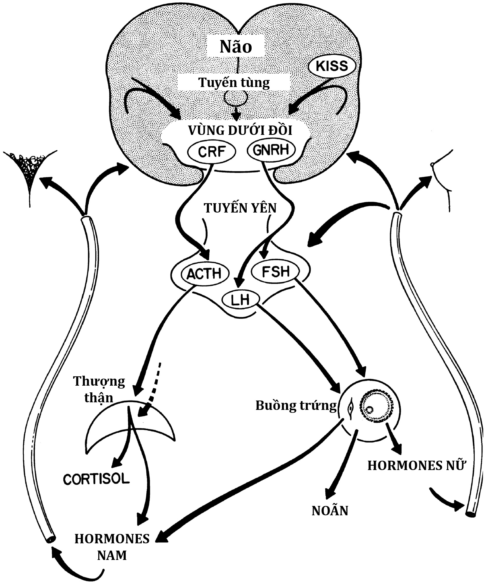 Vào giữa những năm 1960, một khái niệm chung về các yếu tố chính liên quan đến sự khởi phát dậy thì đã được thiết lập (Hình 16.1). Sự giảm nhạy cảm của “bộ điều chỉnh sinh dục” (gonadostat) của não bộ đối với cơ chế điều hòa ngược âm tính của hormone sinh dục được cho là sự kiện chính. Điều này báo hiệu cho vùng dưới đồi tiết ra các chất thần kinh-thể dịch (khi đó chưa được xác định), từ đó kích thích tuyến yên giải phóng gonadotropin. Sự gia tăng bài tiết gonadotropin, hormone tạo hoàng thể (LH) và hormone kích thích nang trứng (FSH), được cho là nguyên nhân trực tiếp làm tăng sản xuất estrogen của buồng trứng. Một mối quan hệ trưởng thành được cho là đã phát triển, trong đó nồng độ estrogen và gonadotropin trong máu được điều hòa tương hỗ thông qua bộ điều chỉnh sinh dục, giống như cách một lò sưởi được điều chỉnh bởi một bộ điều nhiệt. Tuyến tùng được xác định là có đặc tính ức chế tuyến sinh dục. Sự gia tăng bài tiết 17-ketosteroid (17-KS) của vỏ thượng thận, trở nên rõ rệt vào khoảng thời gian dậy thì (“adrenarche” – dậy thì thượng thận), được cho là do một yếu tố từ tuyến yên kích thích androgen thượng thận hiệp đồng với hormone vỏ thượng thận (ACTH).