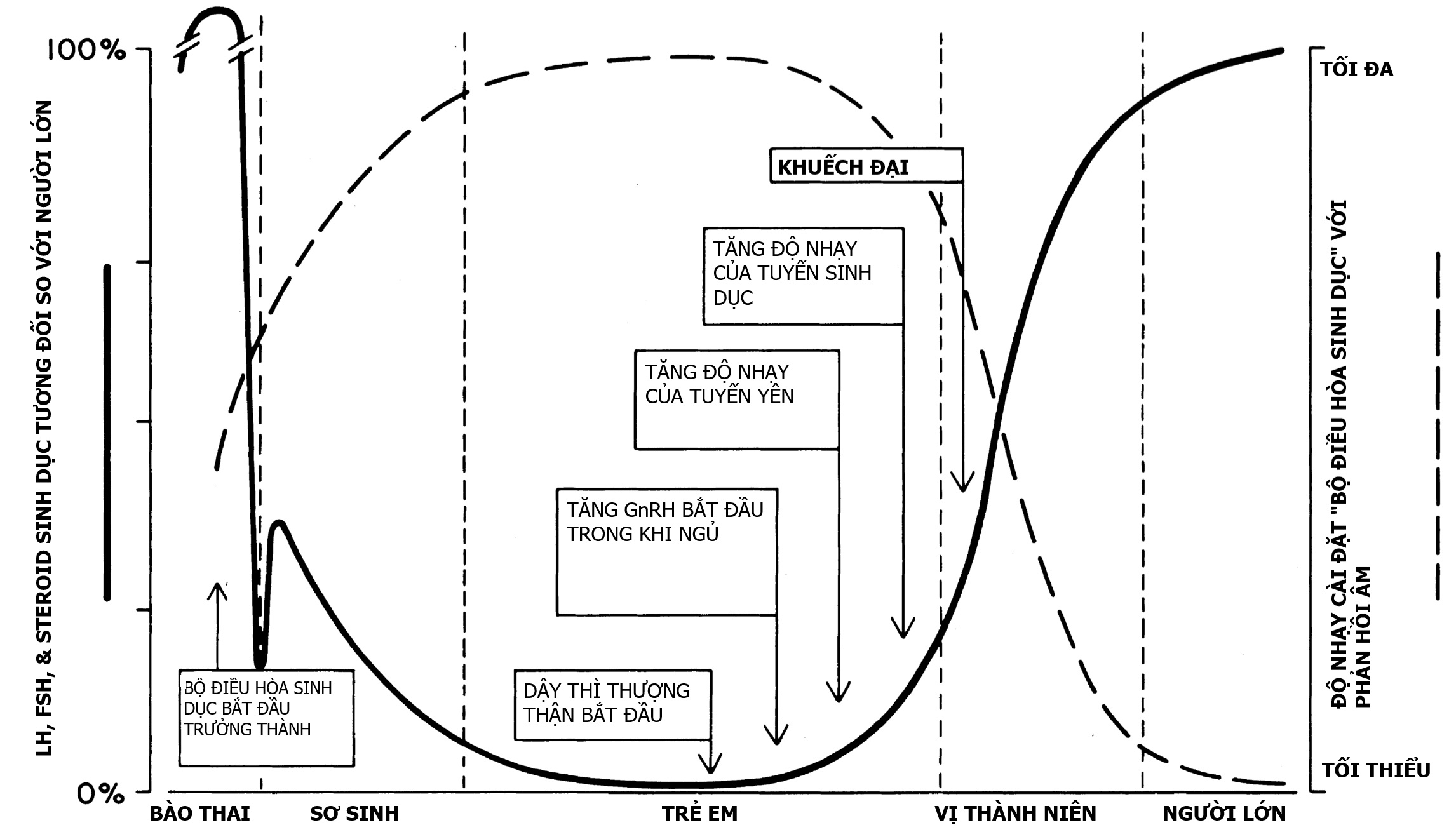 Quan điểm hiện tại của chúng ta về các cơ chế kiểm soát dậy thì đã được tinh chỉnh và phức tạp hơn trước, mặc dù sơ đồ trước đó vẫn đúng về mặt tổng quát. Bộ điều chỉnh sinh dục rõ ràng là một khái niệm quá đơn giản cho một hệ thống phức tạp điều chỉnh hoạt động của bộ tạo xung GnRH ở vùng dưới đồi, một mạng lưới các tế bào thần kinh GnRH được kết nối chức năng và đồng bộ hóa. Ngưỡng của bộ điều chỉnh sinh dục dường như thay đổi trong suốt thời thơ ấu theo kiểu hai pha. Khái niệm này được minh họa trong Hình 16.2. Trong phần lớn cuộc đời bào thai và chu sinh, bộ điều chỉnh sinh dục không nhạy cảm với cơ chế điều hòa ngược âm tính của hormone steroid sinh dục; tại thời điểm này, trục thần kinh-nội tiết-tuyến sinh dục non trẻ hoạt động ở mức độ của tuổi dậy thì. Bộ điều chỉnh sinh dục ngày càng trở nên nhạy cảm với cơ chế điều hòa ngược âm tính trong giai đoạn sơ sinh nhưng chỉ trở nên rất nhạy cảm vào giữa thời thơ ấu, lúc này hoạt động của bộ tạo xung GnRH là tối thiểu. Trong giai đoạn tiền dậy thì muộn, bộ điều chỉnh sinh dục bắt đầu giảm bớt sự ức chế. Điều này cho phép bắt đầu dậy thì. Sự thay đổi ngưỡng ban đầu cho phép tăng cường bài tiết GnRH theo từng đợt. Sau đó là sự gia tăng nhạy cảm của các tế bào gonadotropic của tuyến yên với GnRH. Sự thay đổi trong bài tiết LH và FSH lần đầu tiên có thể phát hiện được trong khi ngủ. Dần dần, các tuyến sinh dục ngày càng nhạy cảm với sự kích thích của gonadotropin, phát triển với tốc độ nhanh hơn và làm tăng nồng độ hormone steroid sinh dục trong huyết tương một cách bền vững. Một số hiện tượng này hiệp đồng với các hiện tượng khác, do đó xảy ra sự tự khuếch đại và tốc độ thay đổi tăng nhanh. Cuối cùng, ngưỡng giải phóng gonadotropin thay đổi đủ để bao gồm một cơ chế điều hòa ngược dương tính.