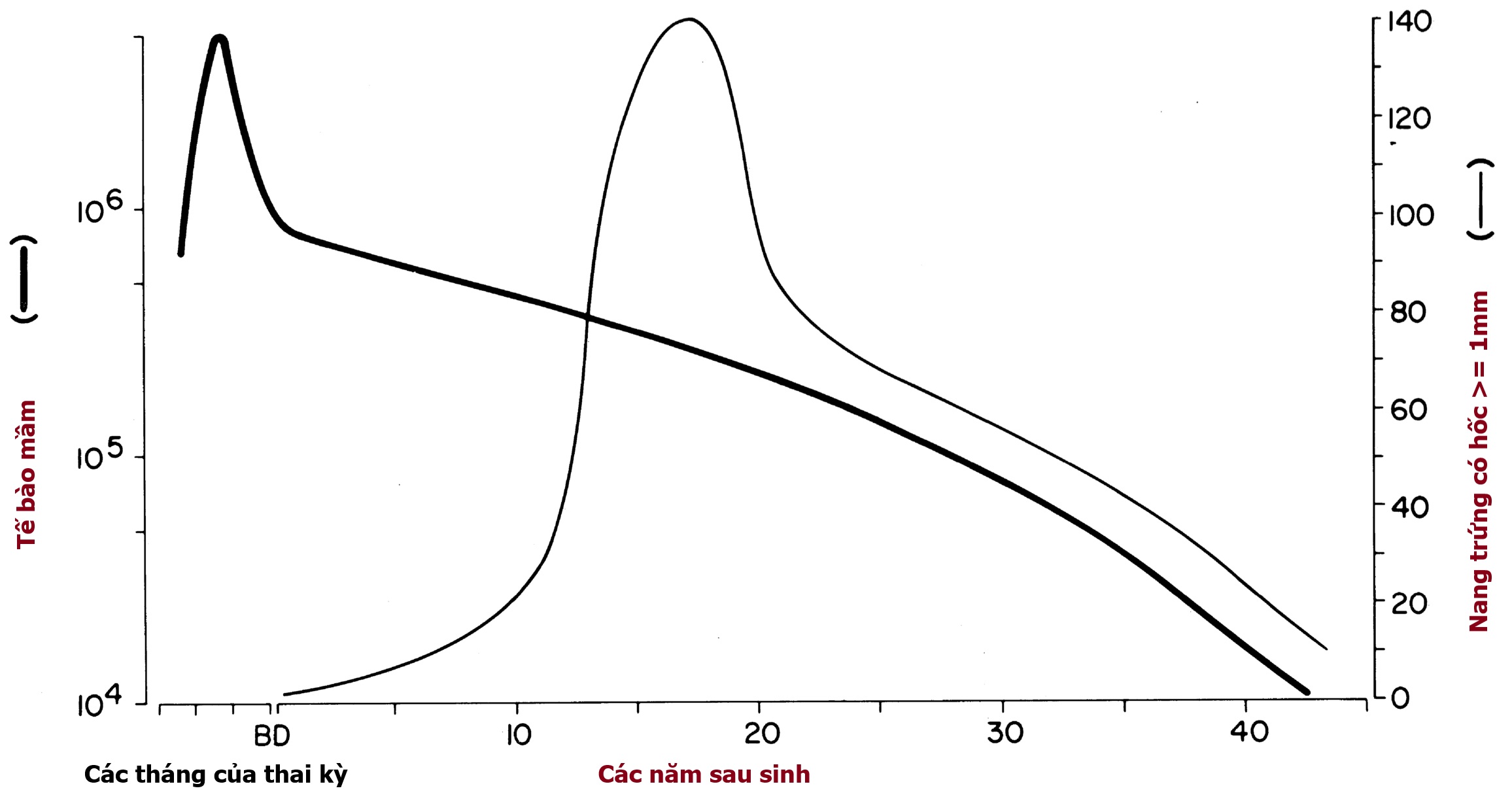 Hình 16.3 Sự phát triển của nang trứng từ giai đoạn bào thai đến khi trưởng thành. Các đường cong cho tổng số tế bào mầm còn sống (đường đậm) và các nang trứng có hốc lớn (đường mảnh) được làm mịn từ dữ liệu của Baker và Block. Số lượng tế bào mầm đạt tối đa vào tháng thứ năm của cuộc đời bào thai. Sự mất mát tế bào mầm diễn ra theo cấp số nhân trong suốt cuộc đời sau khi sinh. Ở tuổi dậy thì, một sự thay đổi rõ rệt xảy ra trong mô hình phát triển của nang trứng. Một phần lớn hơn phát triển đến kích thước có hốc lớn.