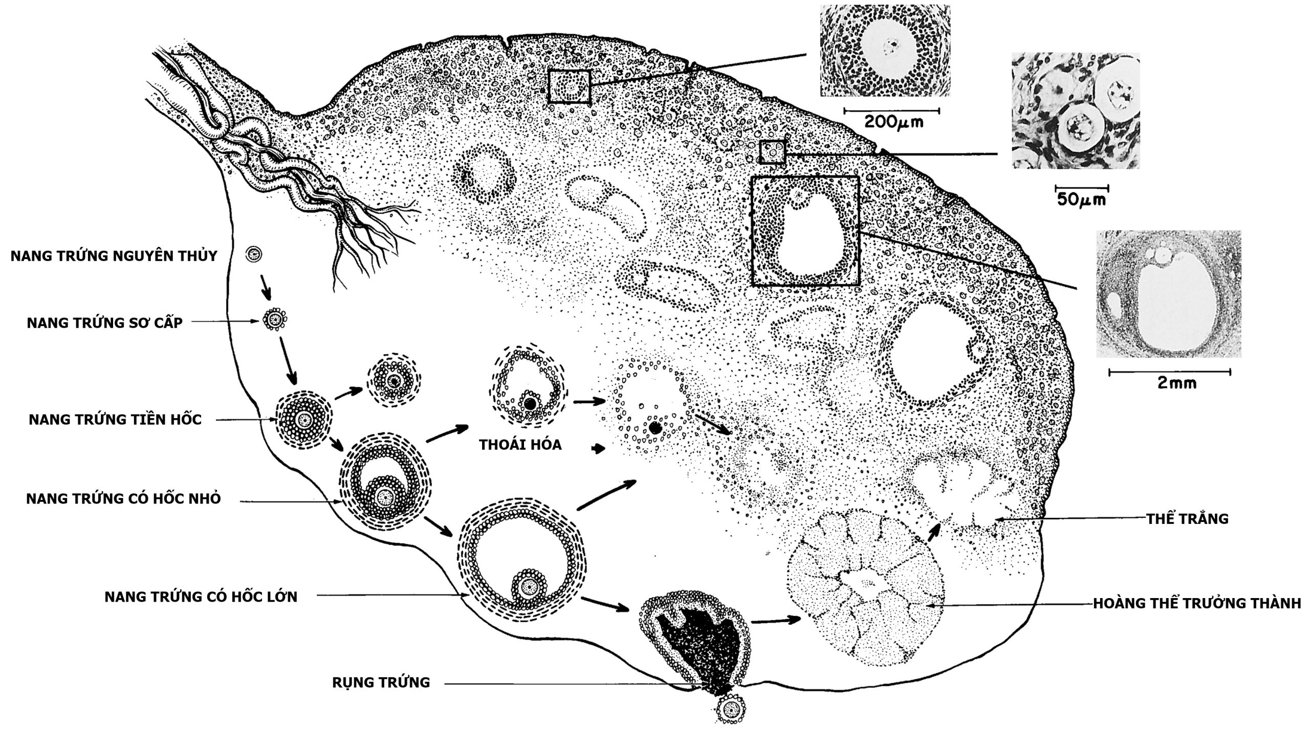 Hình 16.4. Buồng trứng người. Phần dưới của hình cho thấy sự phân loại các nang trứng. Nang trứng tiền hốc chứa tới 300 tế bào hạt, và đường kính của chúng dao động từ 50 đến 200 μm. Đường kính noãn bào tăng từ 25 hoặc nhỏ hơn lên 80 μm. Nang trứng có hốc (Graafian, bậc ba, hoặc nang nước) có một hốc chứa đầy dịch và một noãn bào phát triển đầy đủ, được lót bởi hơn 300 tế bào hạt, và có một lớp vỏ phát triển tốt. Chúng có đường kính lớn hơn 200 μm. Kích thước của buồng trứng trưởng thành xấp xỉ 1.25 × 2.75 × 4 cm. Phần trên của hình minh họa hình ảnh mô học của buồng trứng quanh tuổi có kinh.(Hình ảnh vi mô từ Peters, H. (1979). The human ovary in childhood and early maturity. Eur J Obstet Gynecol Reprod Biol, 9(3), 137; chỉnh sửa từ Ross, G.T., Schreiber, J.R. (1978). The ovary. In: Yen, S.S.C., Jaffe, R. (eds.), Reproductive Endocrinology. Philadelphia, WB Saunders, p. 63.)
