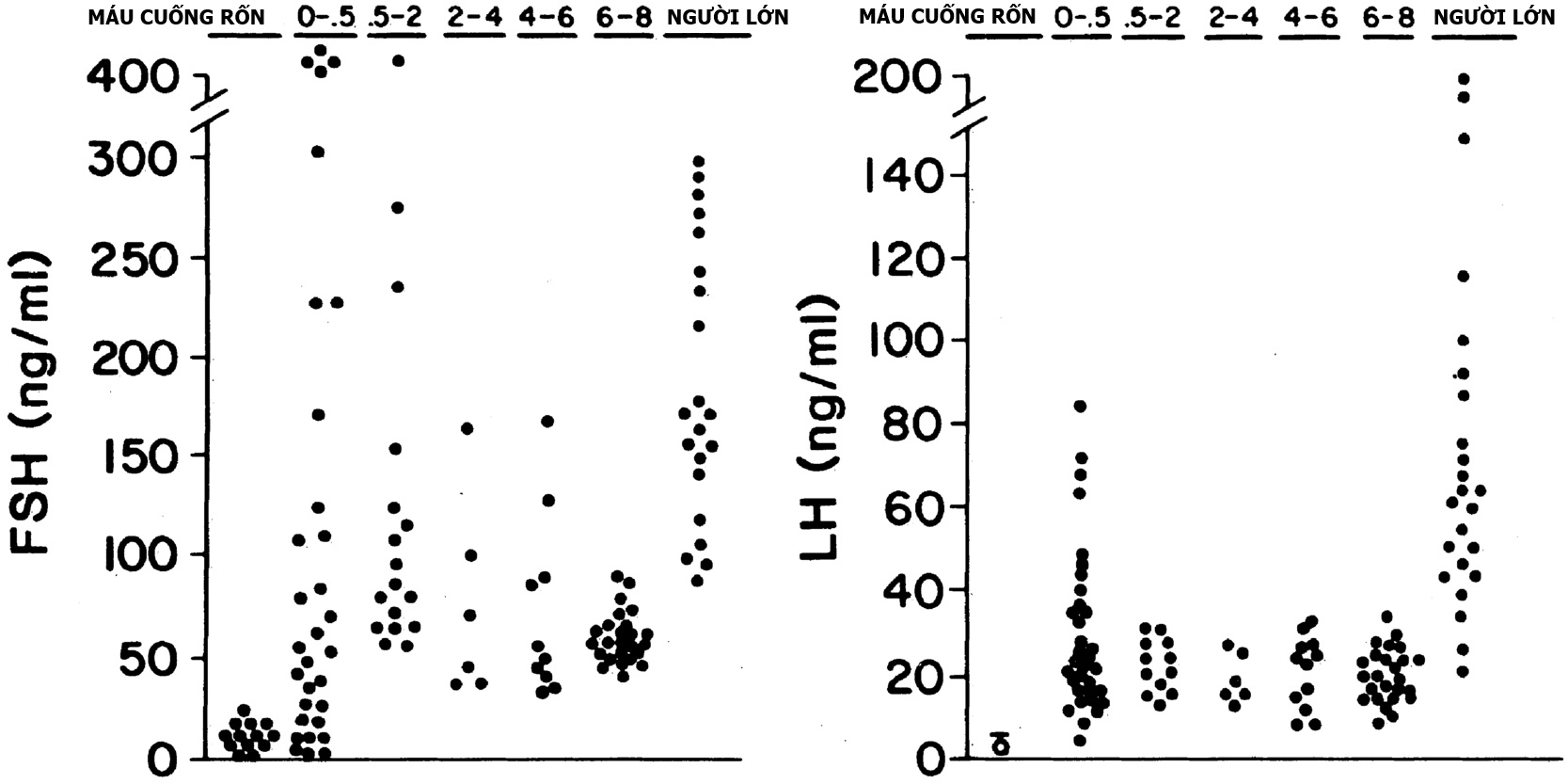 FSH và LH huyết thanh thấp trong máu cuống rốn và duy trì ở mức thấp cho đến khi nồng độ estrogen giảm từ mức ức chế khi đơn vị thai nhi-nhau thai bị gián đoạn lúc sinh. Sau đó, nồng độ LH và FSH của trẻ sơ sinh nhanh chóng bắt đầu tăng theo kiểu xung đến mức dậy thì sớm trong tuần đầu tiên của cuộc đời (xem Hình 16.5).
