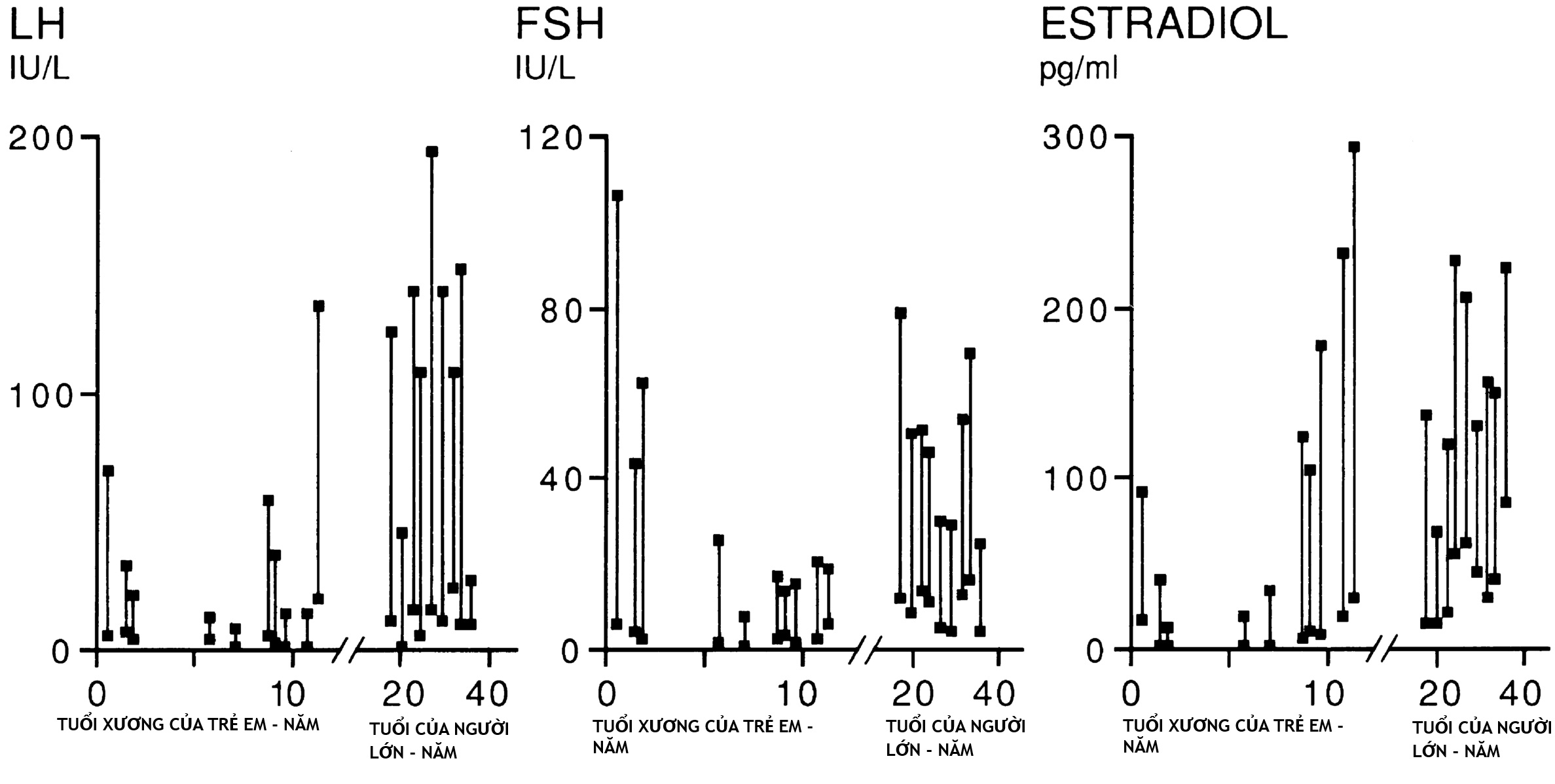 (Dữ liệu từ Rosenfield, R,L. (2007). Identifying children at risk of polycystic ovary syndrome. J Clin Endocrinol Metab, 92, 787–791; Rosenfield, R.L., Bordini, B., Yu, C. (2013). Comparison of detection of normal puberty in girls by a hormonal sleep test and a gonadotropin-releasing hormone agonist test. J Clin Endocrinol Metab, 98, 1591–1601; Mortensen, M., Ehrmann, D.A., Littlejohn, E., Rosenfield, R.L. (2009). Asymptomatic volunteers with a polycystic ovary are a functionally distinct but heterogeneous population. J Clin Endocrinol Metab, 94, 1579–1586; Forest, M. (1979). Function of the ovary in the neonate and infant. Eur J Obstet Gynecol Reprod Biol, 9, 145–160; de Peretti, E., Forest, M.G. (1982). Pitfalls in the etiological diagnosis of congenital adrenal hyperplasia in the early neonatal period. Horm Res, 16, 10–22; Bidlingmaier, F., Knorr, D. (1978). Oestrogens: physiologic and clinical aspects. Pediatr Adolesc Endocrinol, 4, 41–84; Chellakooty, M., Schmidt, I.M., Haavisto, A.M., Boisen, K.A., Damgaard, I.N., Mau, C., et al. (2003). Inhibin A, inhibin B, follicle-stimulating hormone, luteinizing hormone, estradiol, and sex hormone-binding globulin levels in 473 healthy infant girls. J Clin Endocrinol Metab, 88, 3516–3520; Greaves, R.F., Pitkin, J., Ho, C.S., Baglin, J., Hunt, R.W., Zacharin, M.R. (2015). Hormone modeling in preterm neonates: establishment of pituitary and steroid hormone reference intervals. J Clin Endocrinol Metab, 100, 1097–1103; Johannsen, T.H., Main, K.M., Ljubicic, M.L., Jensen, T.K., Andersen, H.R., Andersen, M.S., et al. (2018). Sex differences in reproductive hormones during mini-puberty in infants with normal and disordered sex development. J Clin Endocrinol Metab, 103, 3028–3037; Endocrine Sciences/LabCorp. 2018 Expected Values and S.I. Unit Conversion Tables.)