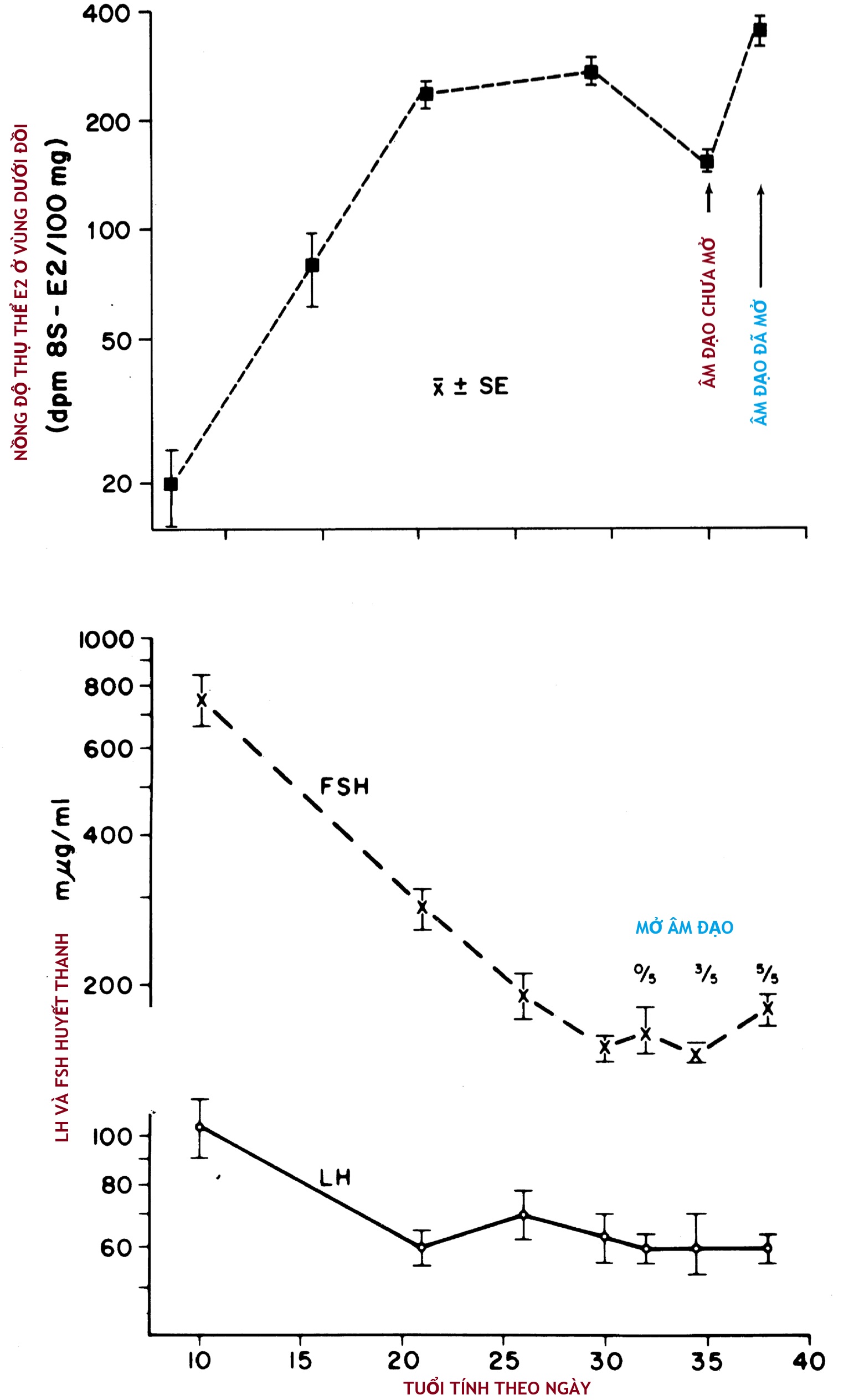 Hình 16.7 Mối quan hệ giữa sự trưởng thành của các thụ thể estrogen ở vùng dưới đồi (trên) với nồng độ gonadotropin trong huyết thanh (dưới) ở chuột cái đang phát triển. FSH, Hormone kích thích nang trứng; LH, hormone tạo hoàng thể. (Từ Rosenfield, R.L. (1977). Hormonal events and disorders of puberty. In: Givens, J.R. (ed.), Gynecologic Endocrinology. Chicago, Year Book Medical. Được phép của Mosby-Year Book.)